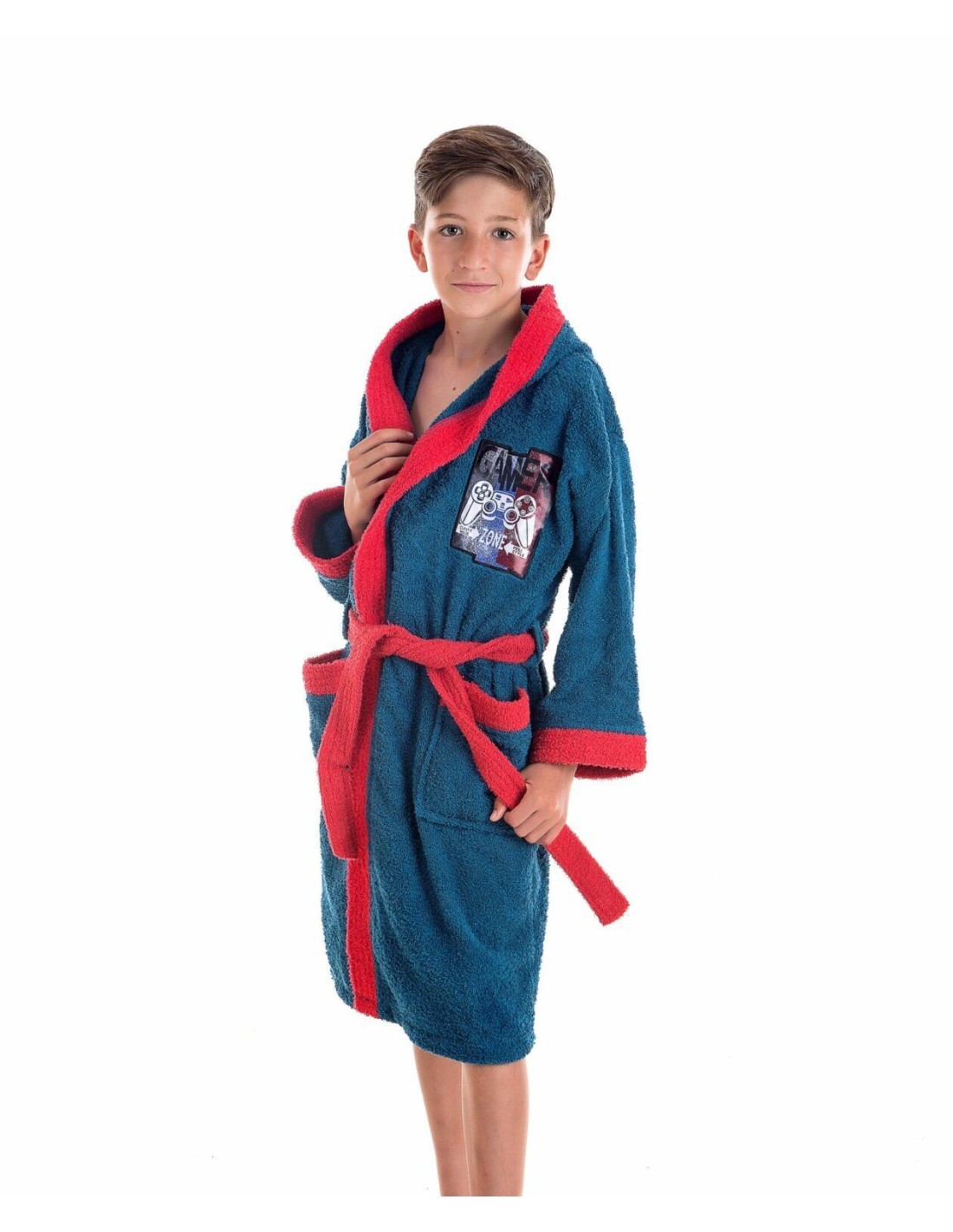 Albornoz infantil con capucha en color azul marino y cinturón, bolsillos y puños en rojo.
