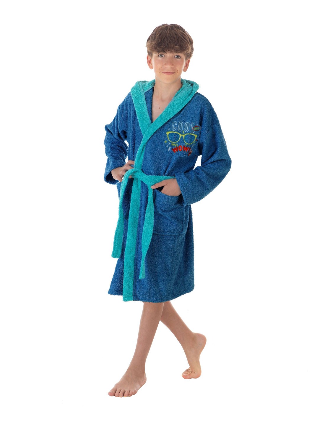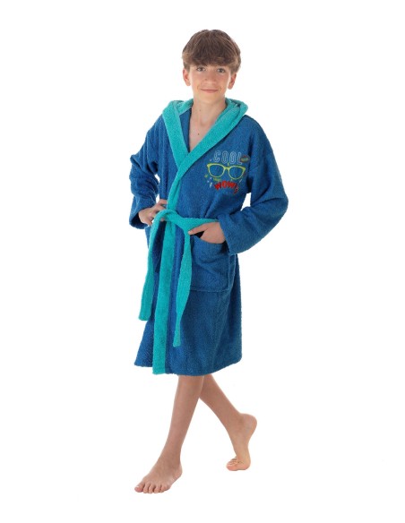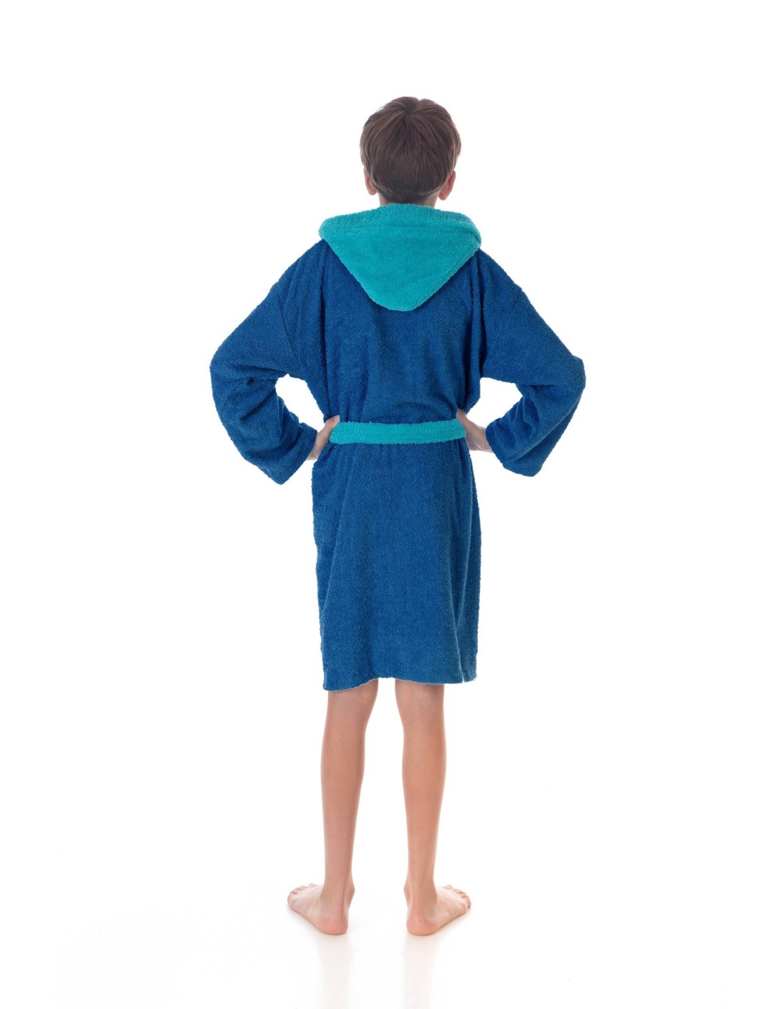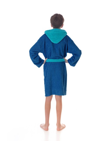 Albornoz infantil con capucha en color azul marino y cinturón, bolsillos y puños en azul claro.
