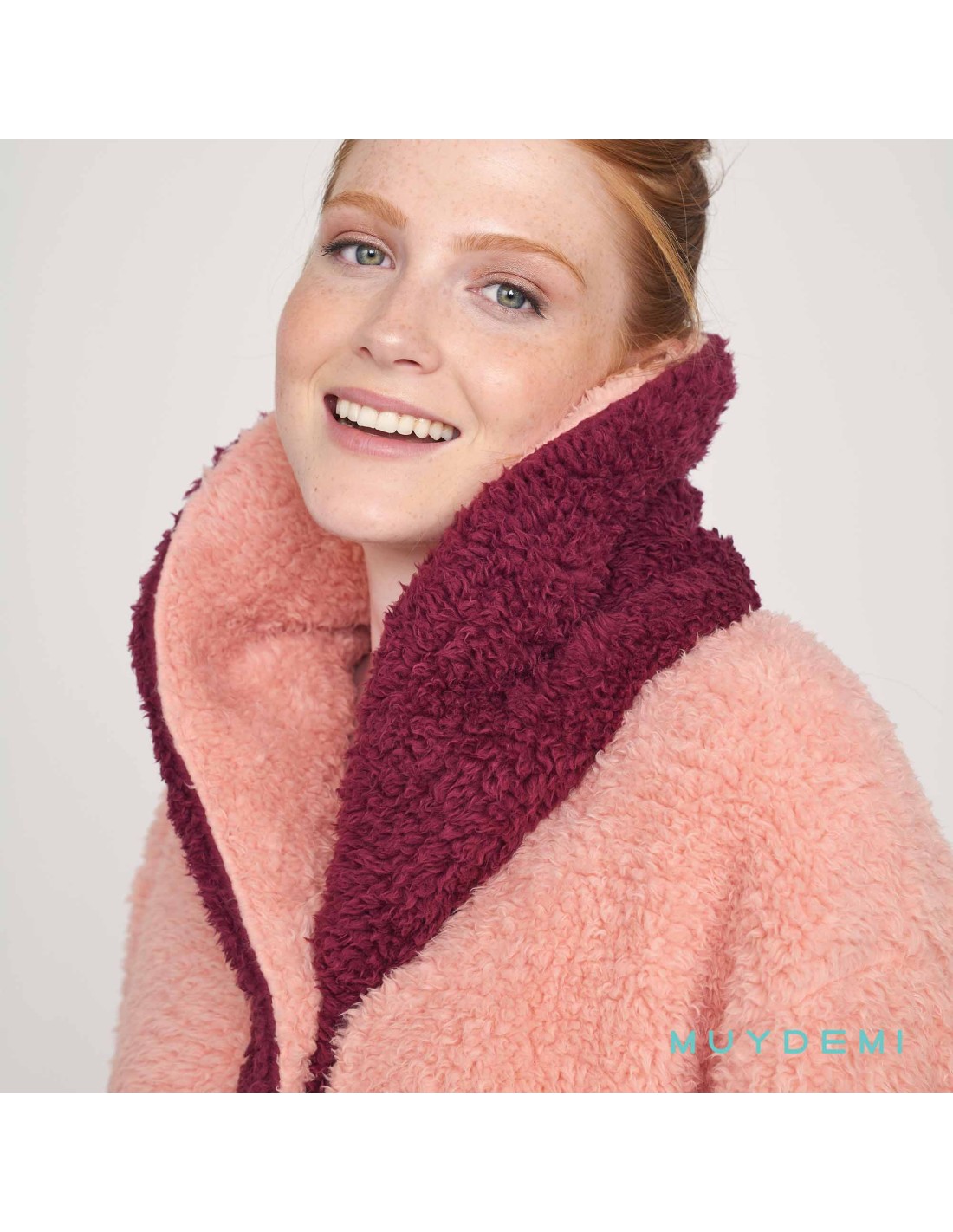 Bata polar de mujer de borreguillo 100% poliéster. Con posibilidad de cuello vuelto o alto.