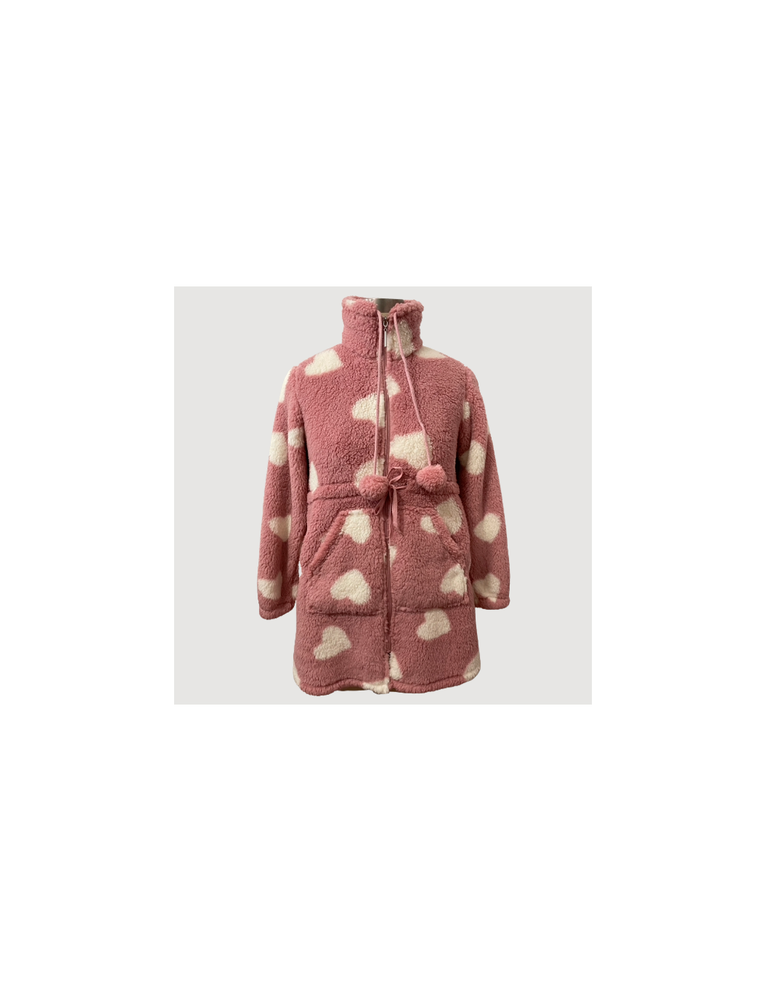 Bata corta de mujer de color rosa con corazones blancos. Con dos bolsillos exteriores, goma en la cintura, cierre de cremallera y dos cordones en el cuello con dos pom poms.