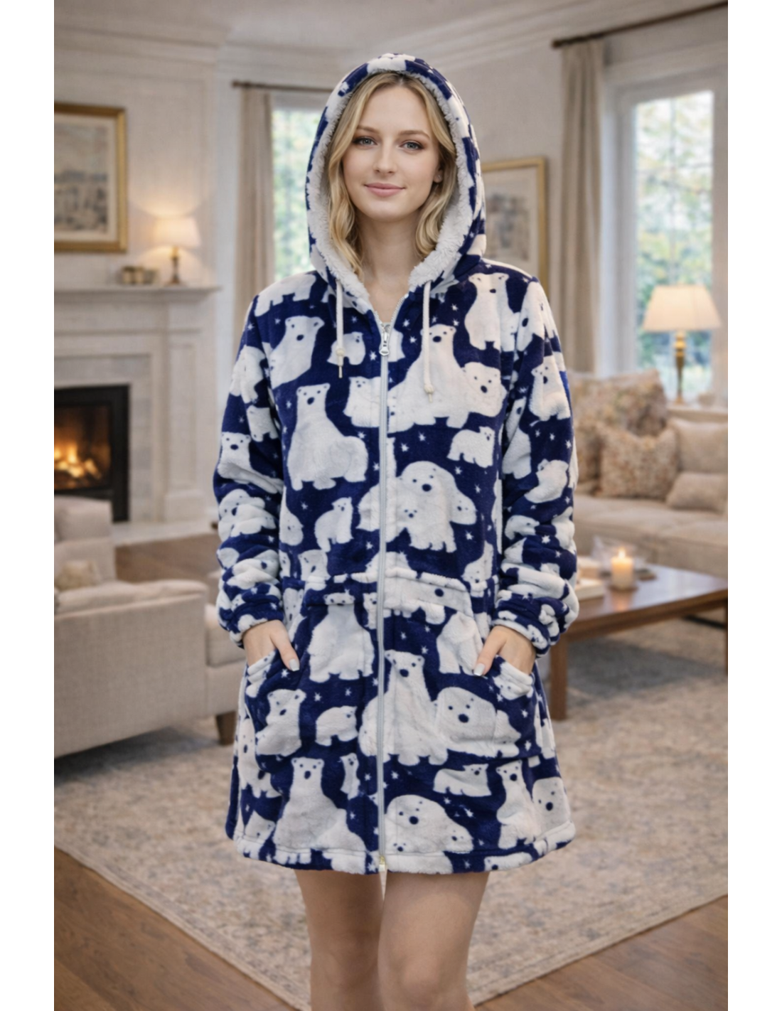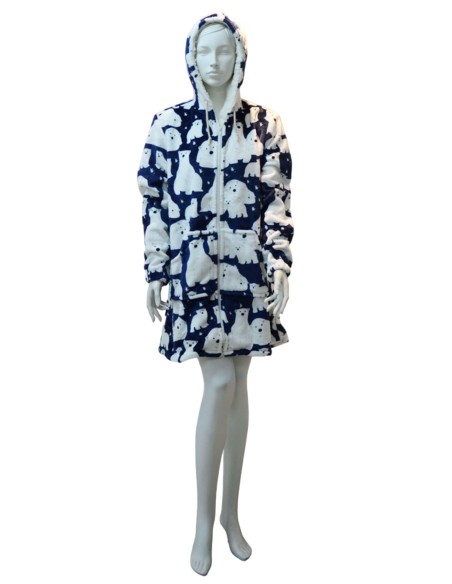 Bata corta de mujer de color marino con estampado de osos polares. Con bolsillos exteriores grandes. Cierre con cremallera y capucha con borreguillo.