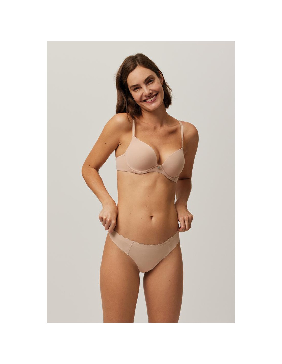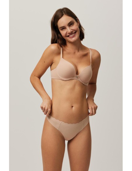 Tanga de tejido de microfibra cortado a láser con cinturilla ondulada y con costuras muy discretas que hacen que la prenda sea imperceptible bajo la ropa. La comodidad y sujeción de este tanga es algo a destacar.