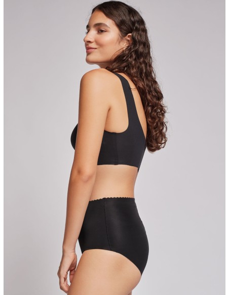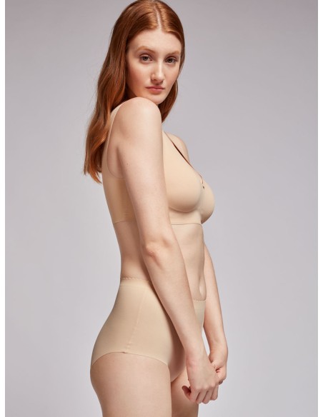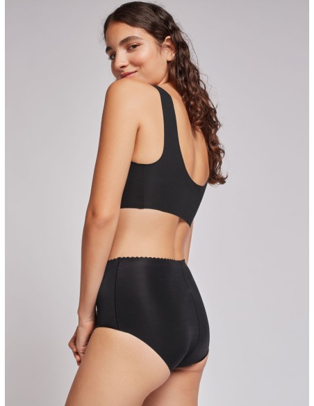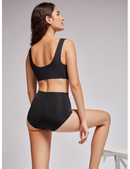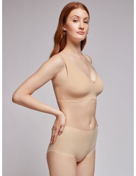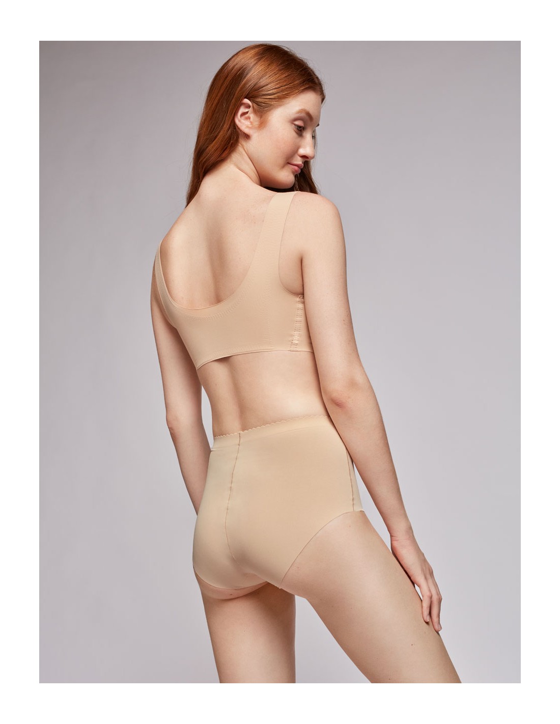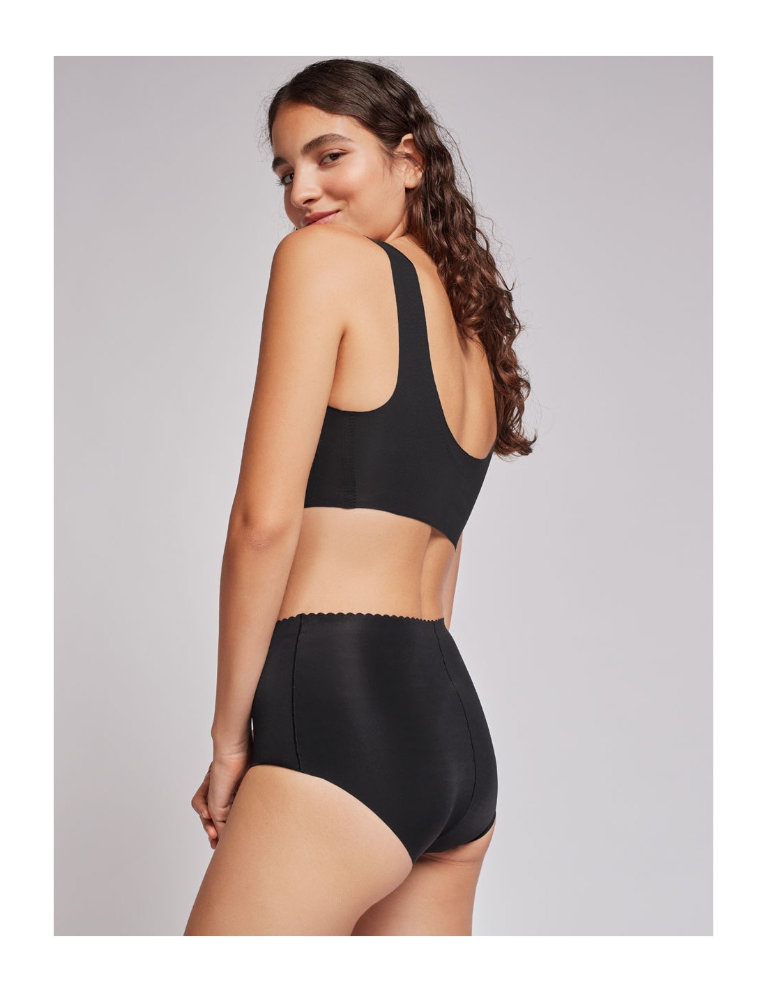Braguita alta invisible en tejido de microfibra con cintura termofusionada y corte láser para evitar marcas bajo la ropa.