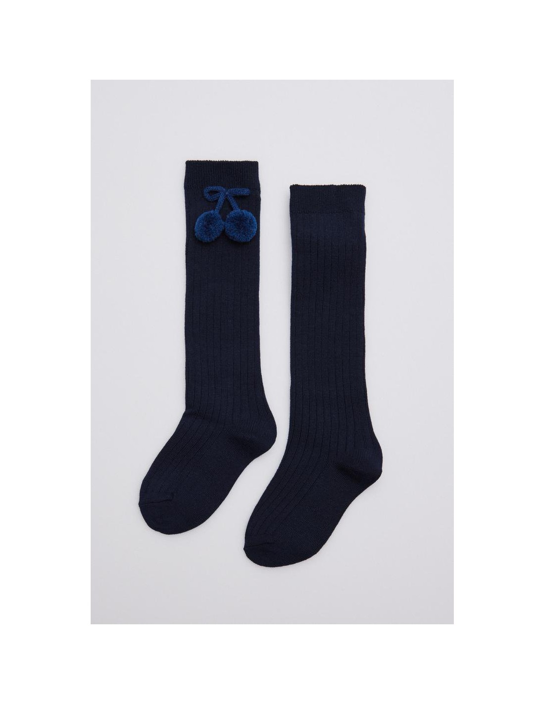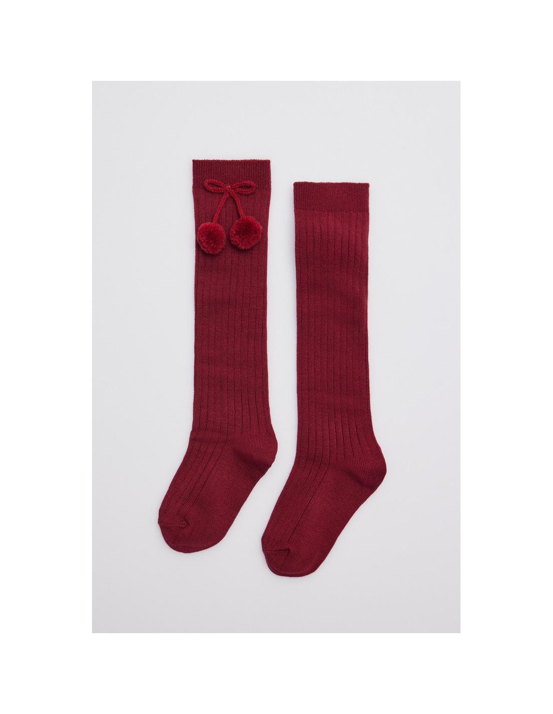 Calcetín infantil largo para niña con puño antipresión. Tejido con textura y decorado con mini pompones en el lateral. Disponibles en variedad de colores.