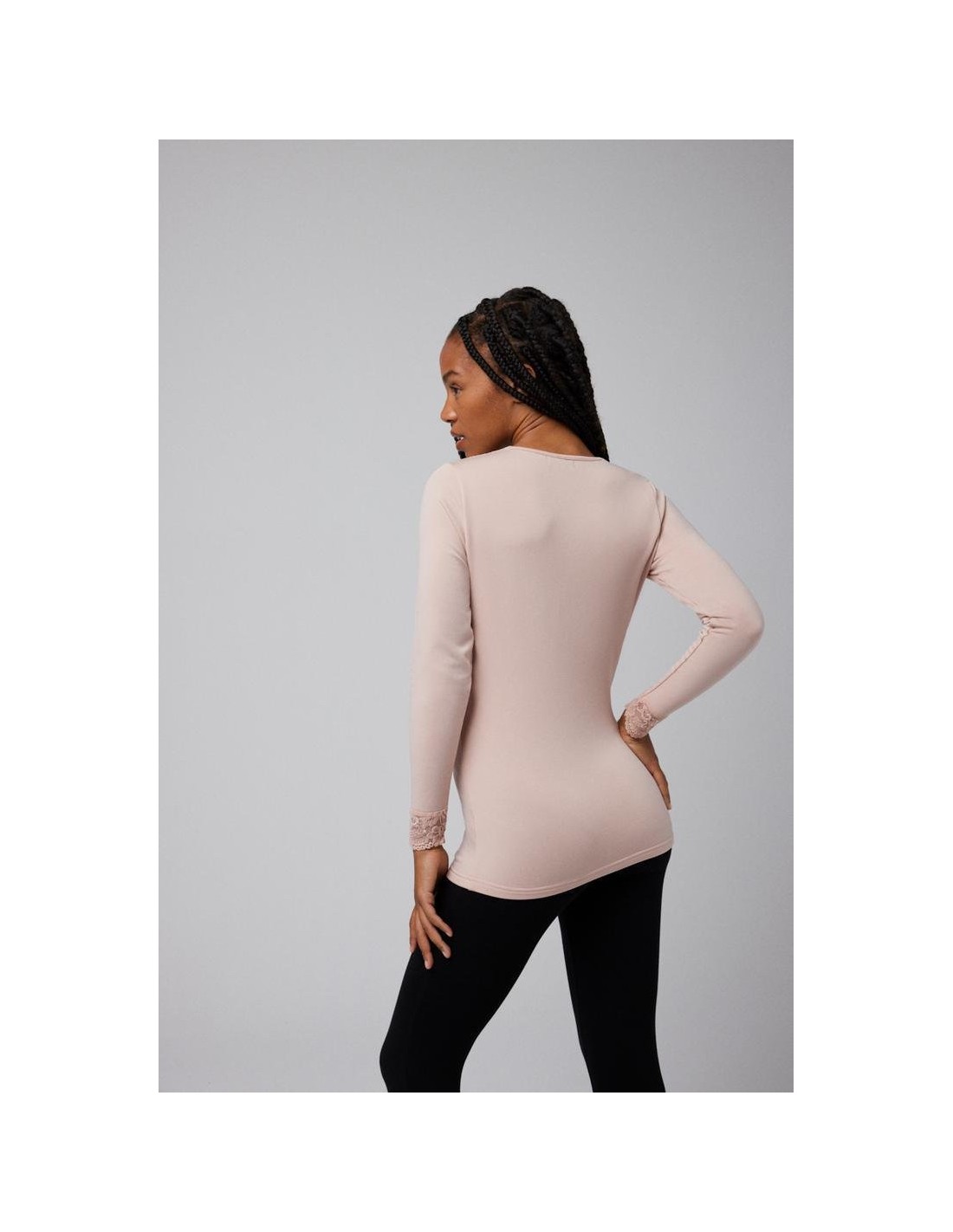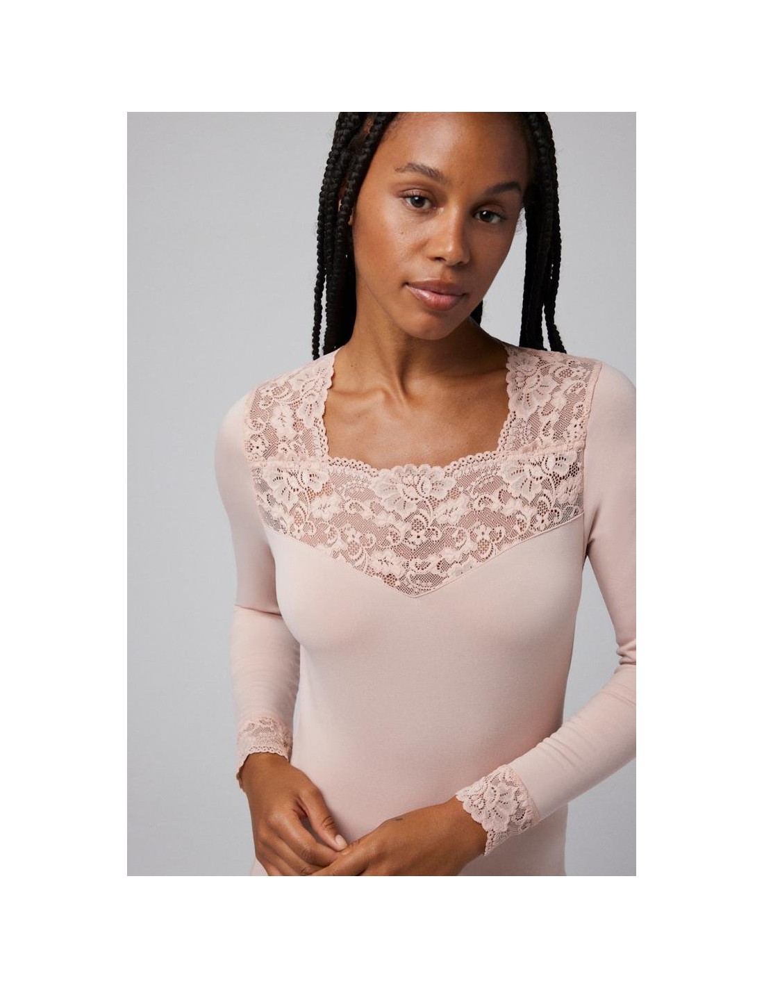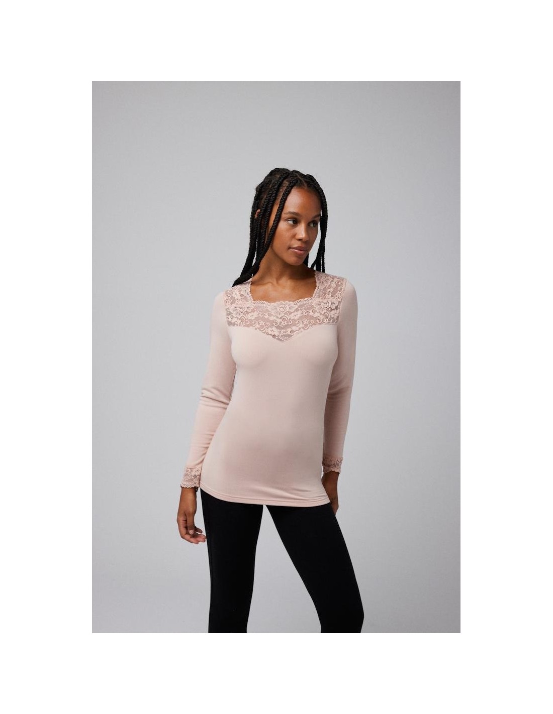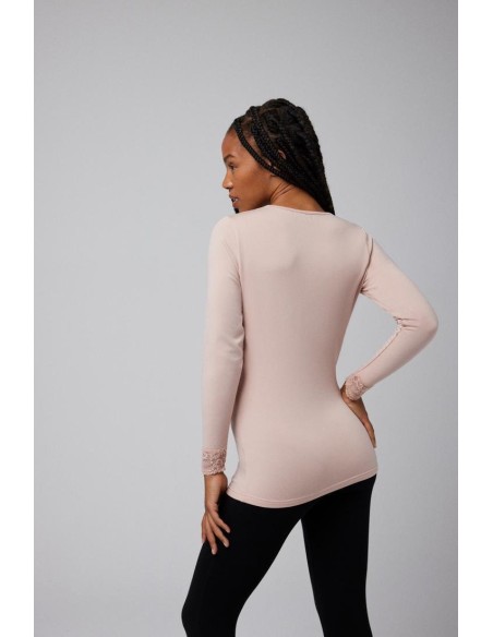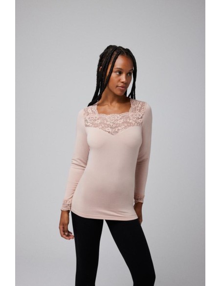 Camiseta térmica para mujer con detalles en encaje. La tecnología térmica evoluciona de la manera más sensual en esta camiseta que combina efectividad y elegancia. Un toque femenino a esta clásica camiseta funcional térmica con la que combatir las bajas temperaturas. Disponible en color granate, azul y negro. Interior afelpado
