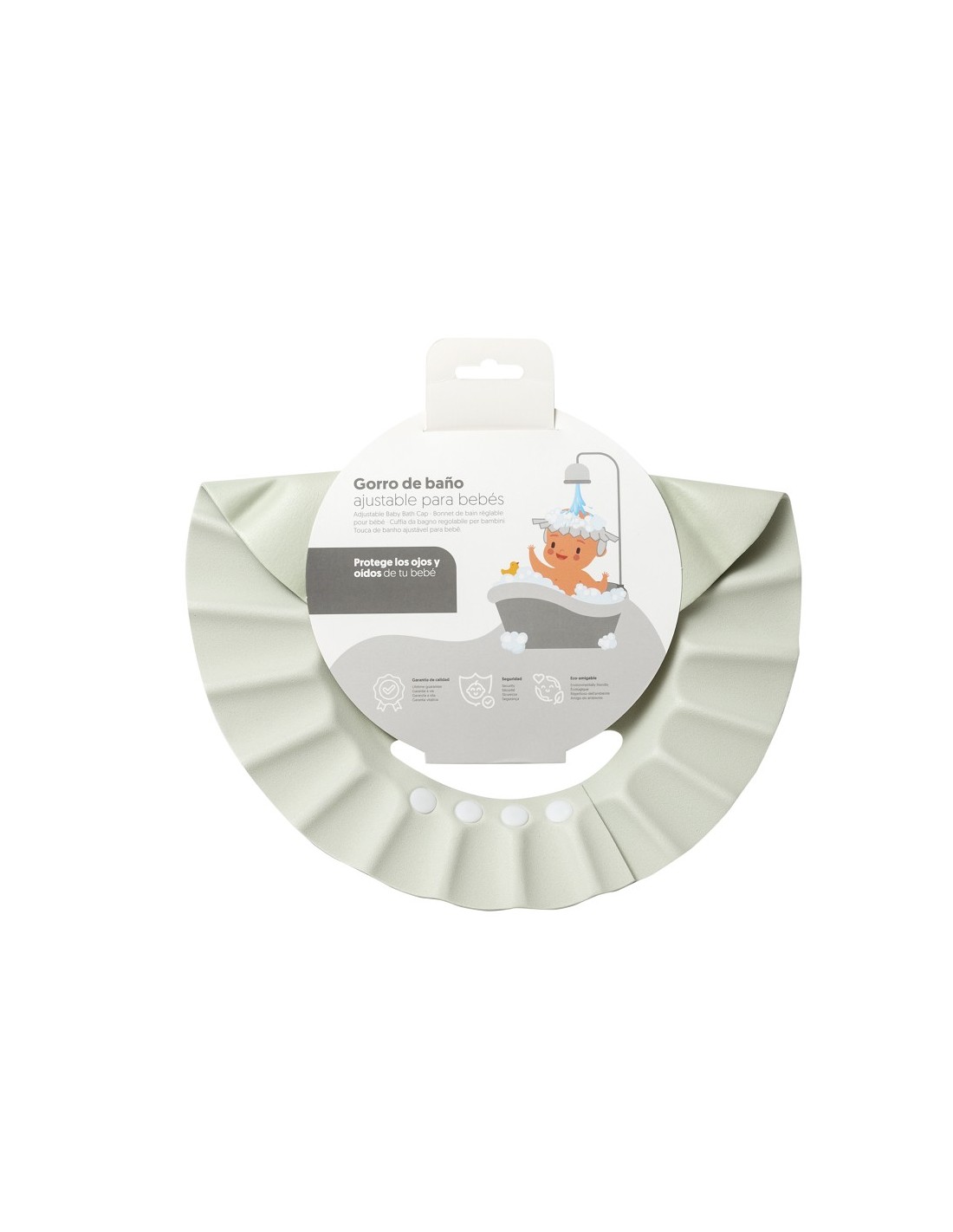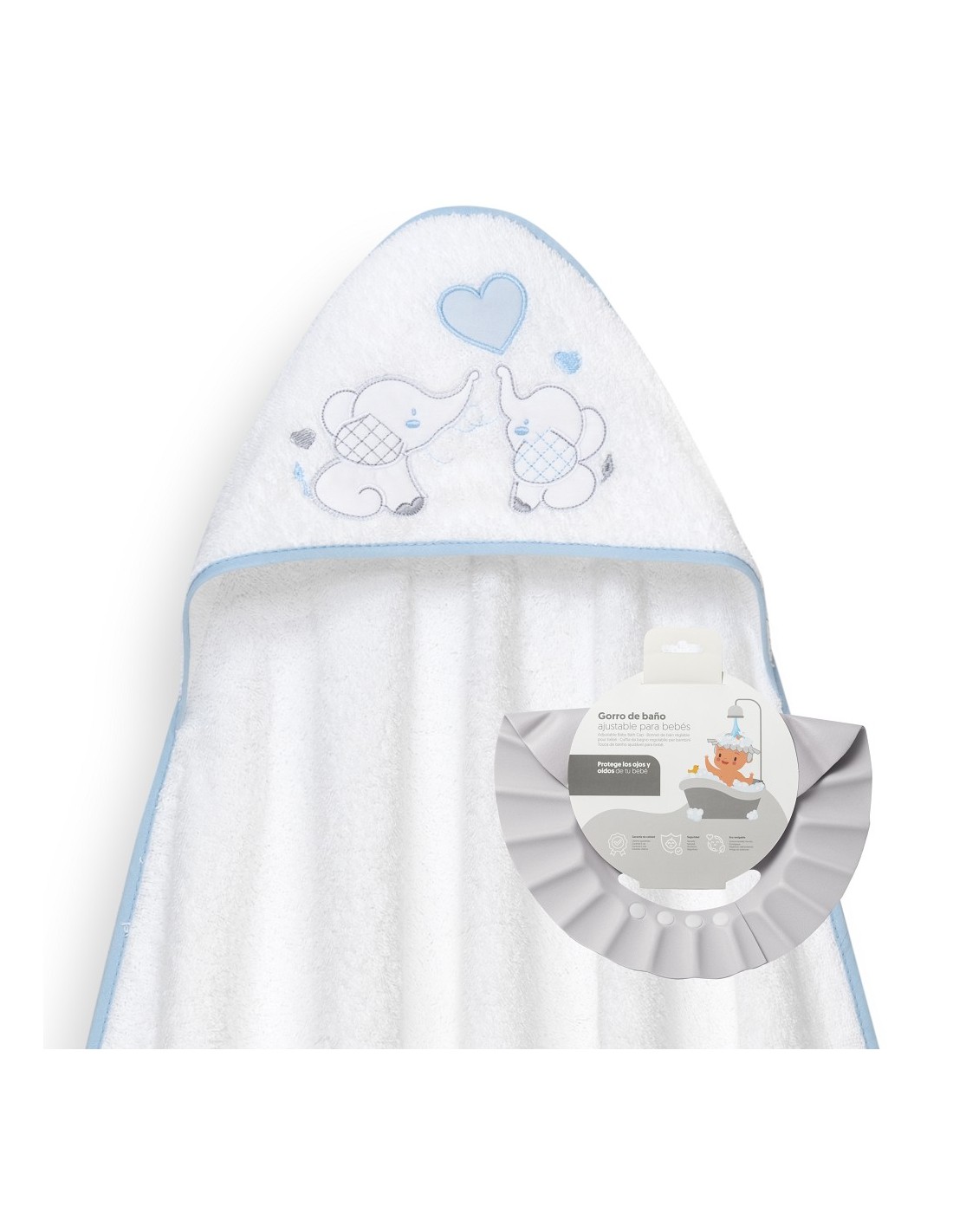 Capa de algodón y gorro ajustable que protege los ojos y los oídos del bebé en el baño.