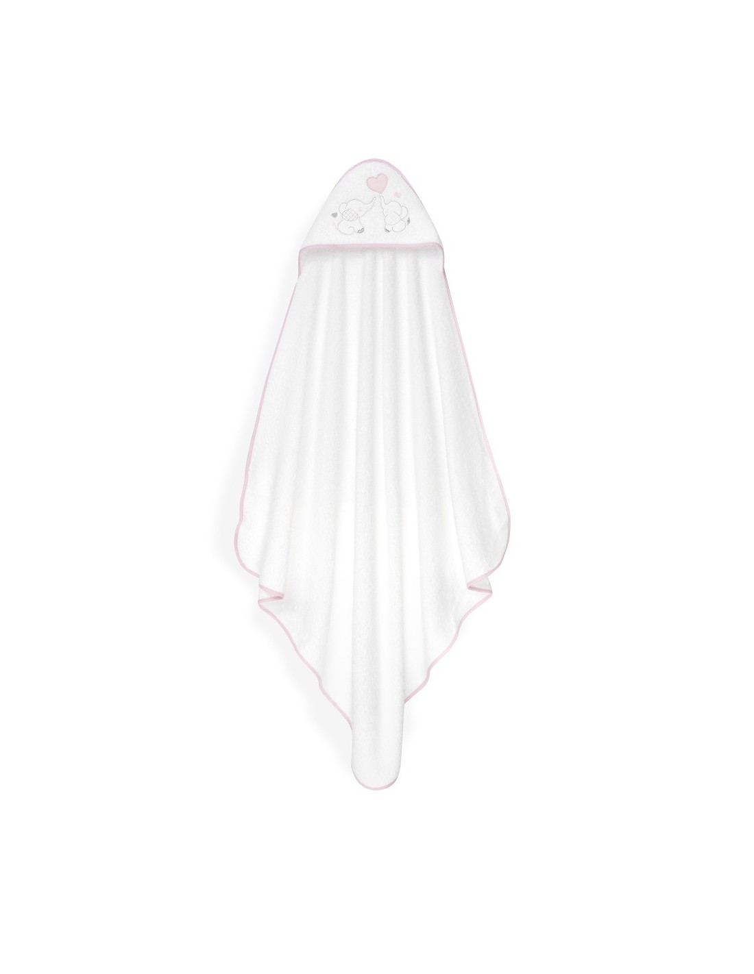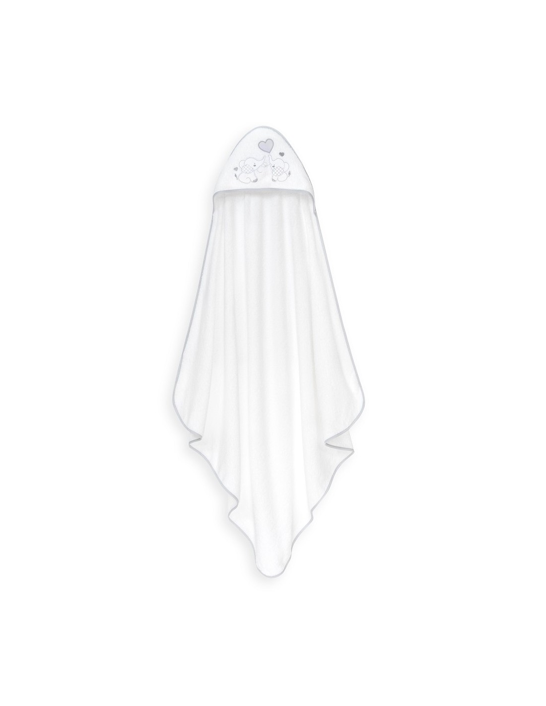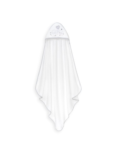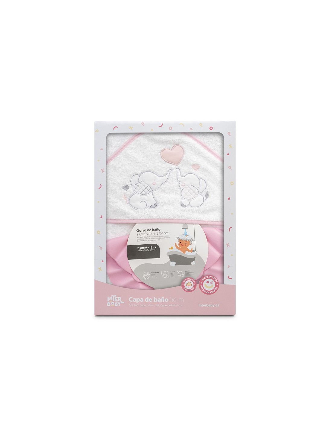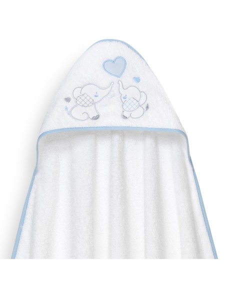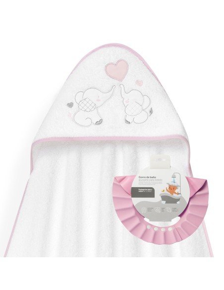 Set de regalo compuesto por capa de baño y gorro de baño. Con diseño de elefantitos y corazón.