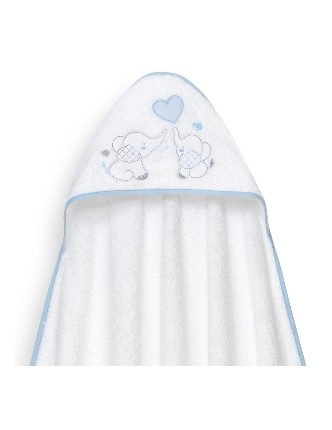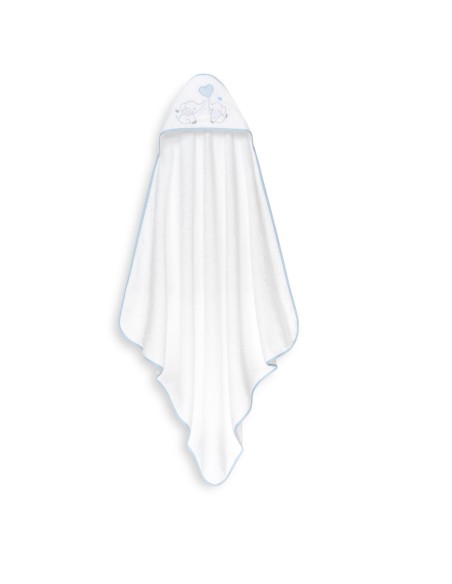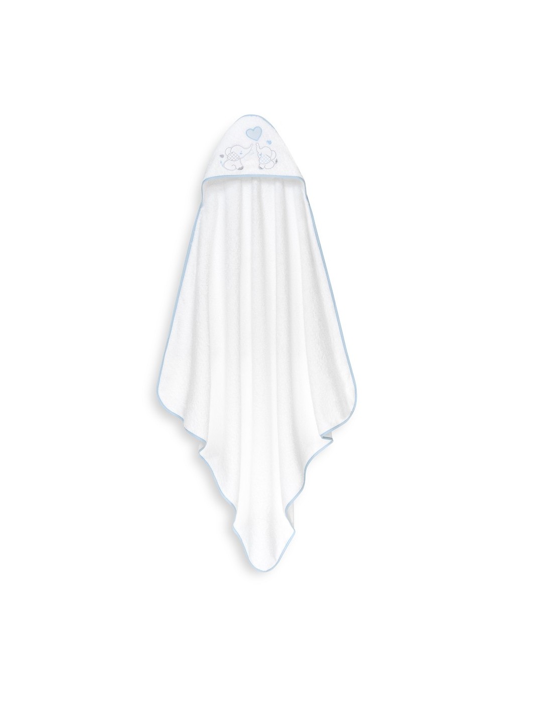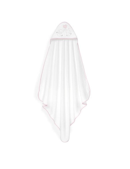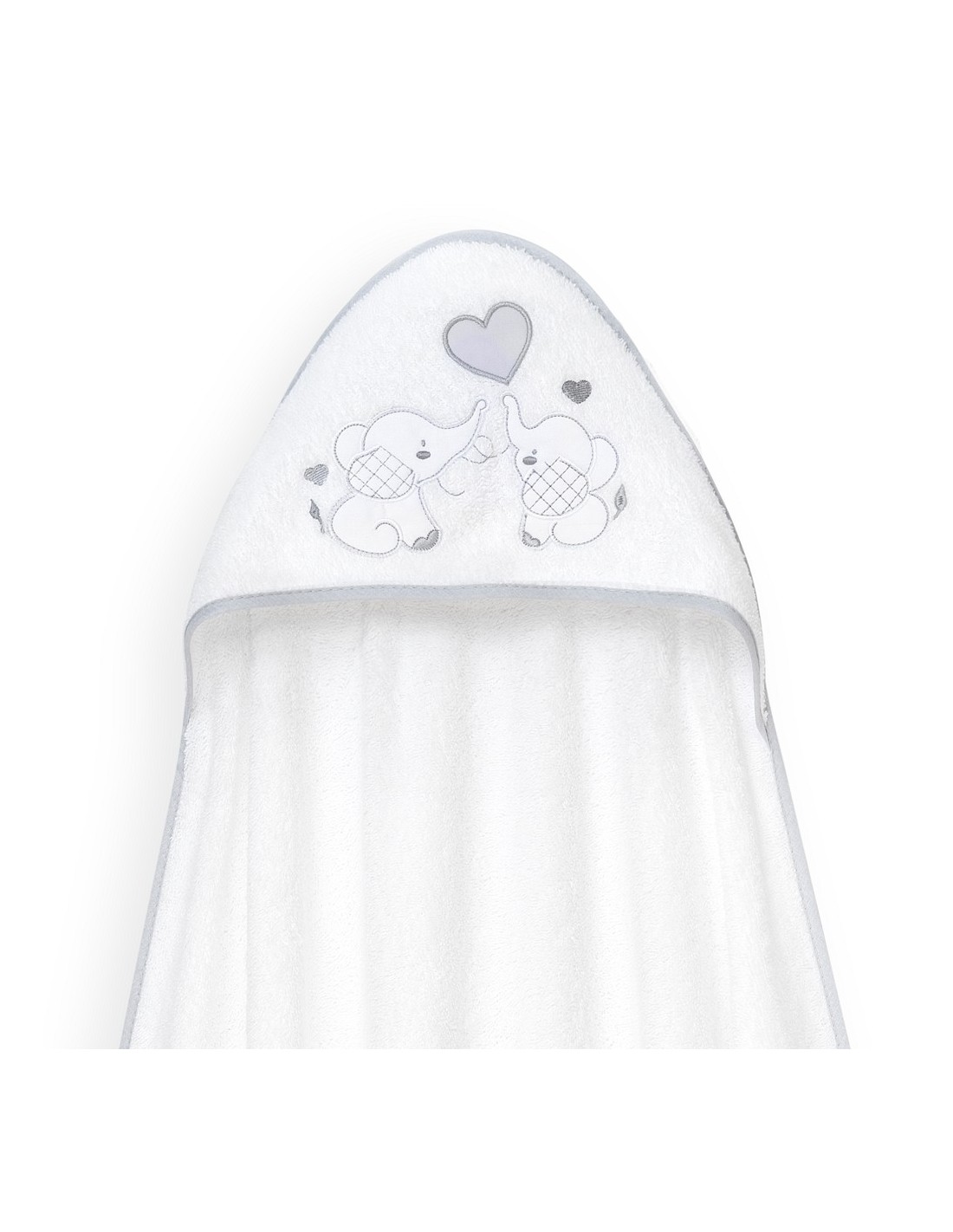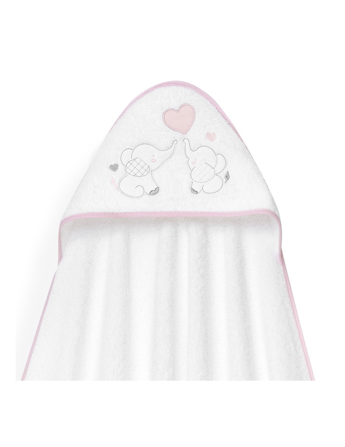 Set de regalo compuesto por capa de baño y gorro de baño. Con diseño de elefantitos y corazón.