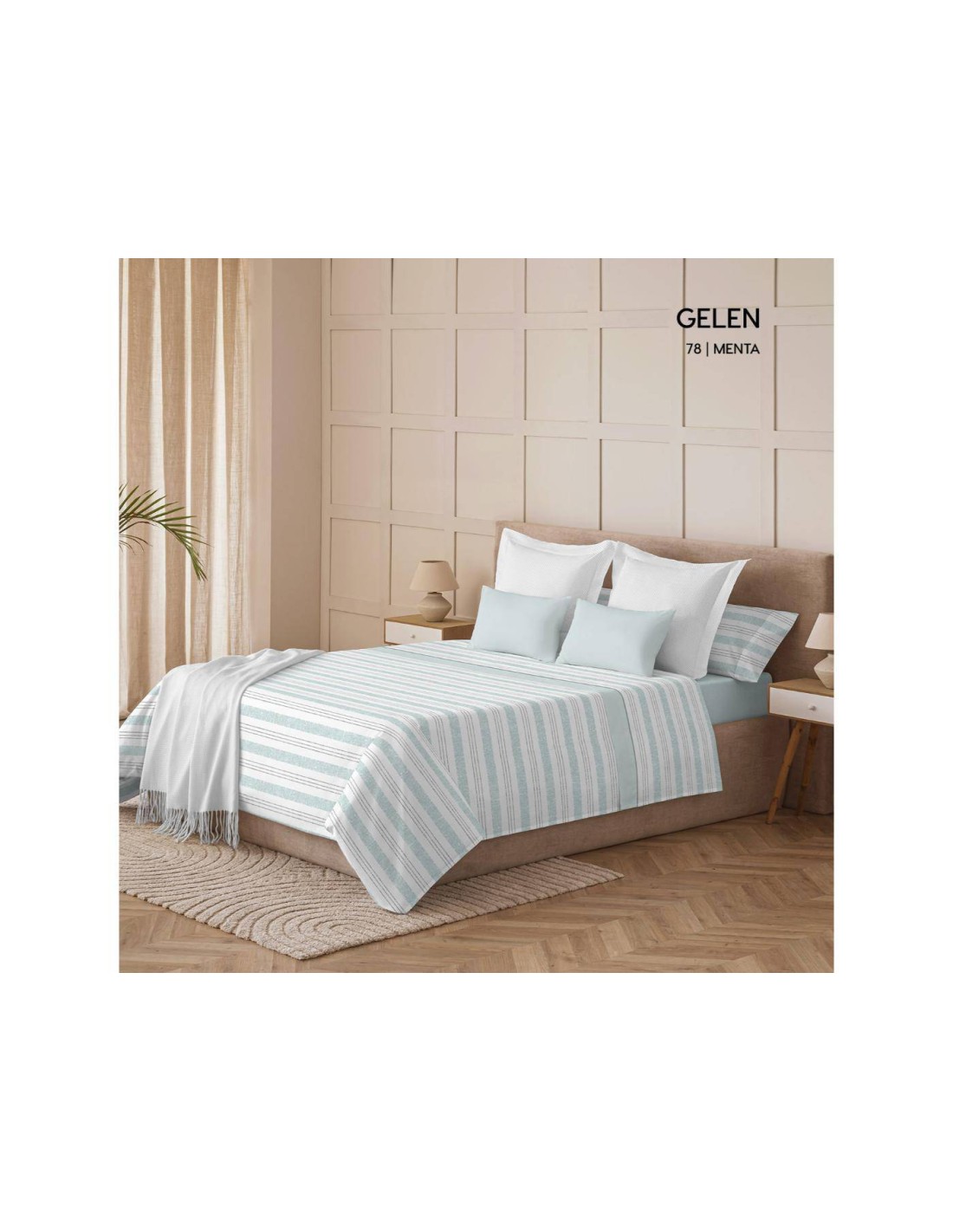 Bajera lisa de color y sábana encimera y funda de almohada a rayas y franjas.