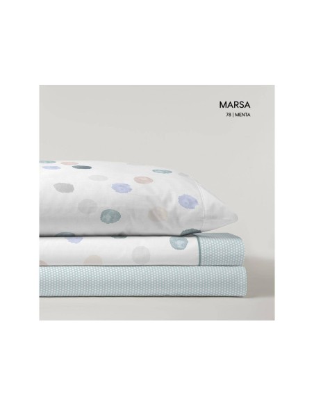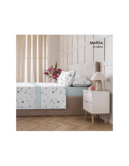 Bajera estampada de pequeños lunares y sábana encimera y funda de almohada con estampado de círculos estilo acuarelas.