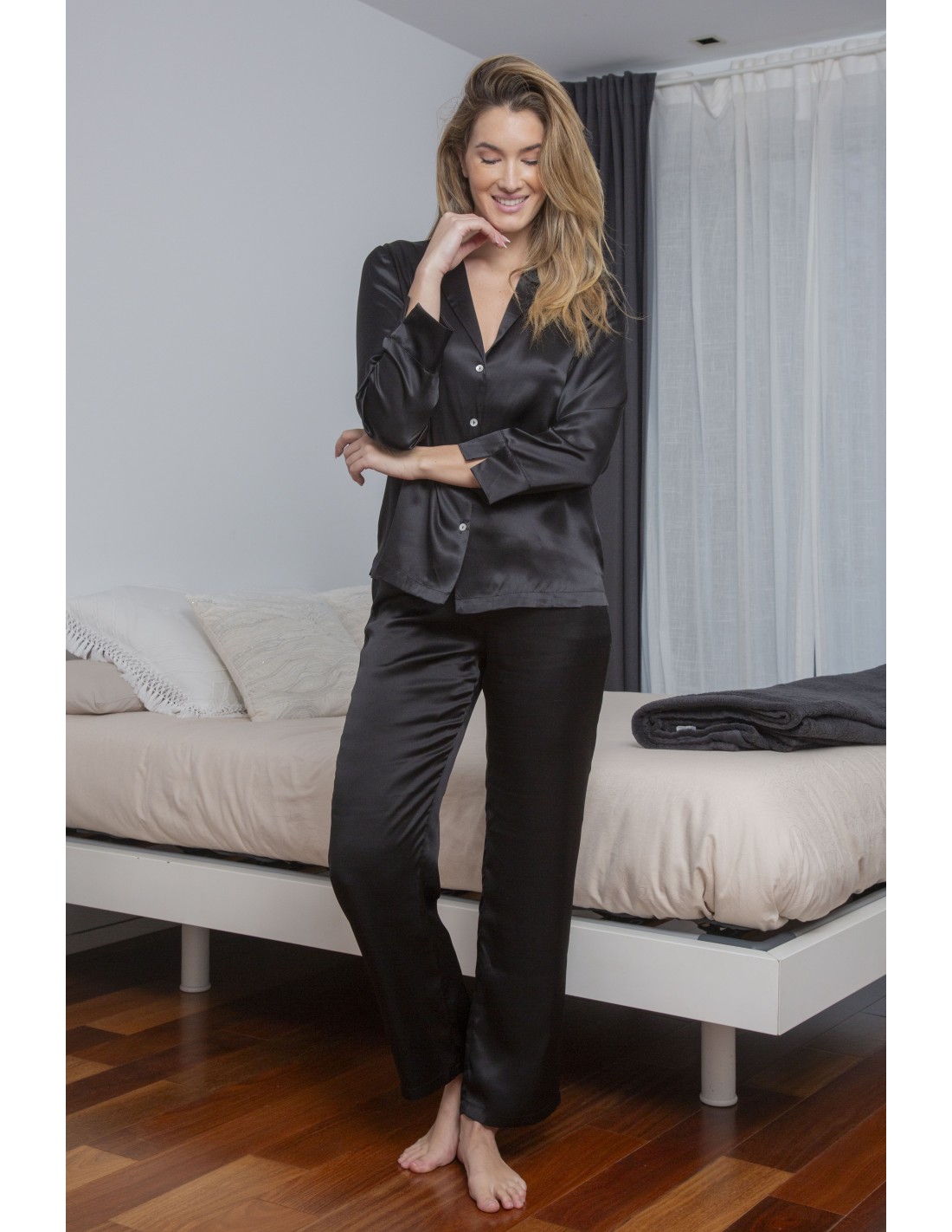 Pijama para mujer compuesto por camisa de botones abierta de color negro y pantalón liso negro.