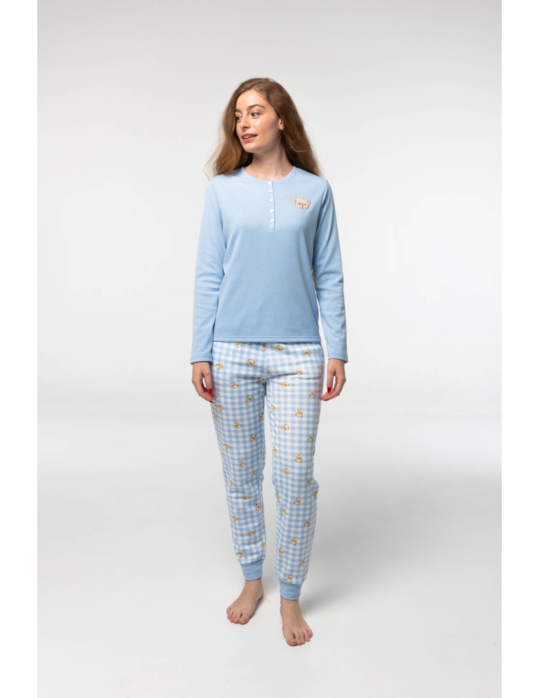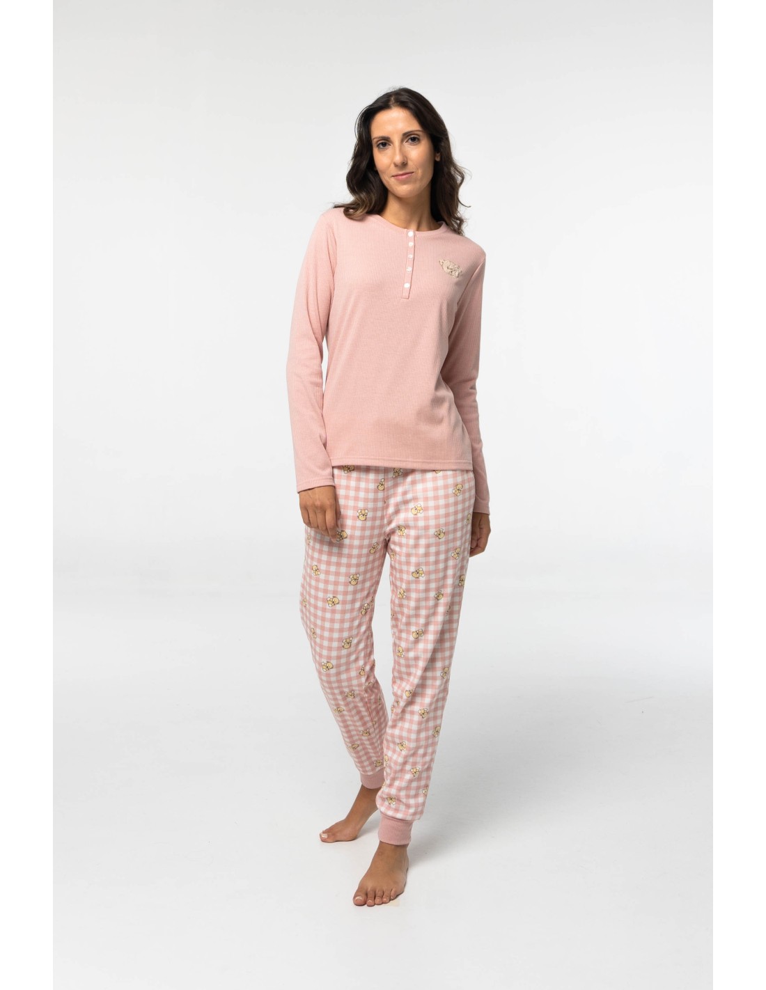 Pijama de algodón afelpado para mujer compuesto por camiseta estilo canalé con pequeño dibujo de osito y pantalón a cuadros con estampado de ositos de peluche.
