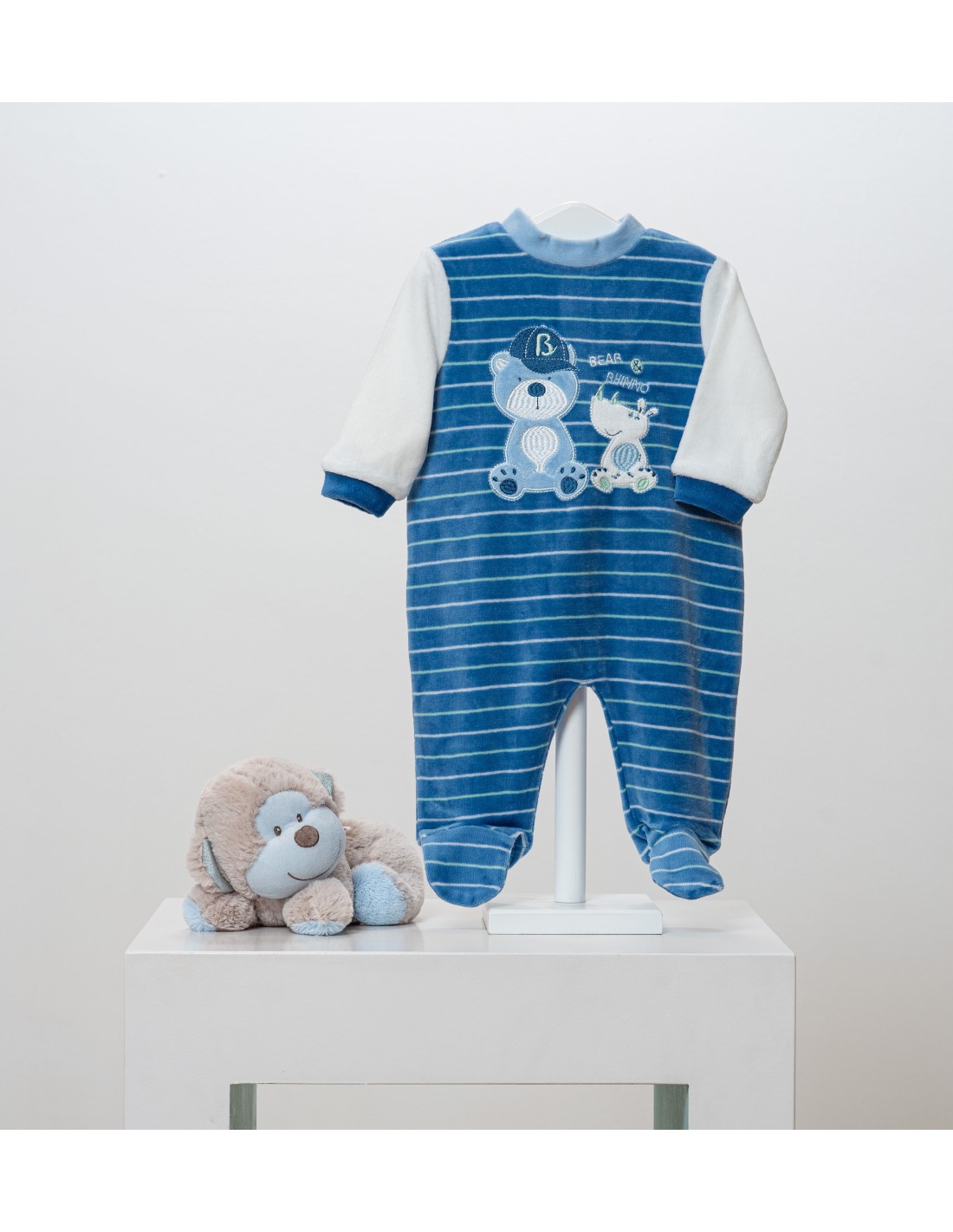 Pelele de bebé de terciopelo marca Kinanit de color azul rayado con bordado de osito y rinoceronte. Mangas de color blanco.