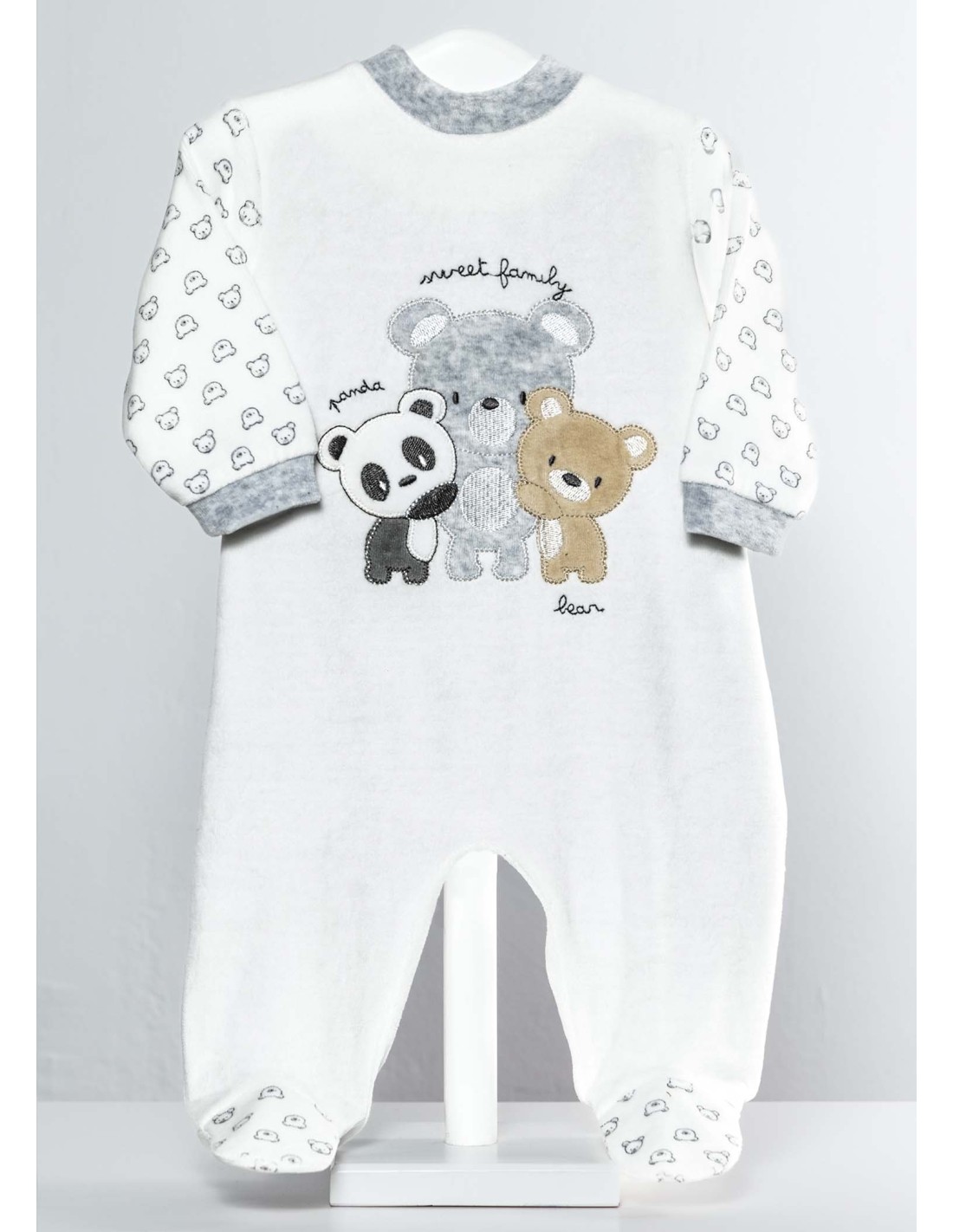 Pelele de bebé de terciopelo marca Kinanit de color blanco con bordado de diferentes ositos. Mangas blancas estampadas con caritas de ositos.