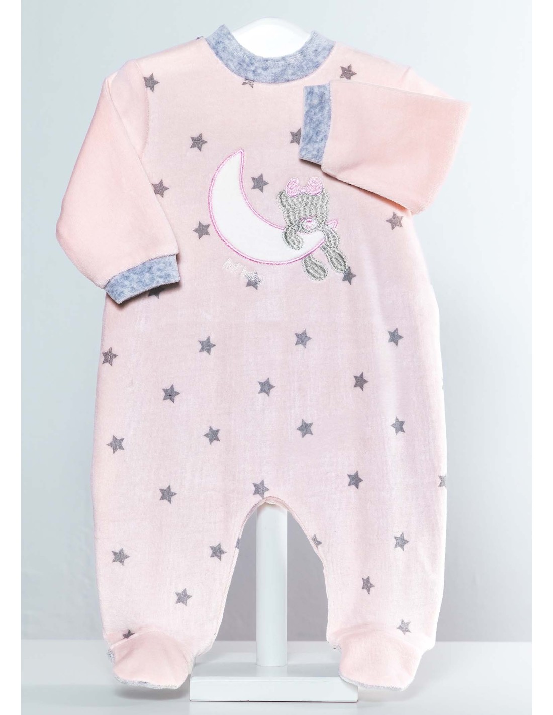 Pelele de bebé de terciopelo marca Kinanit de color rosa con bordado de osito y luna con estampado de estrellas. Mangas de color rosa.