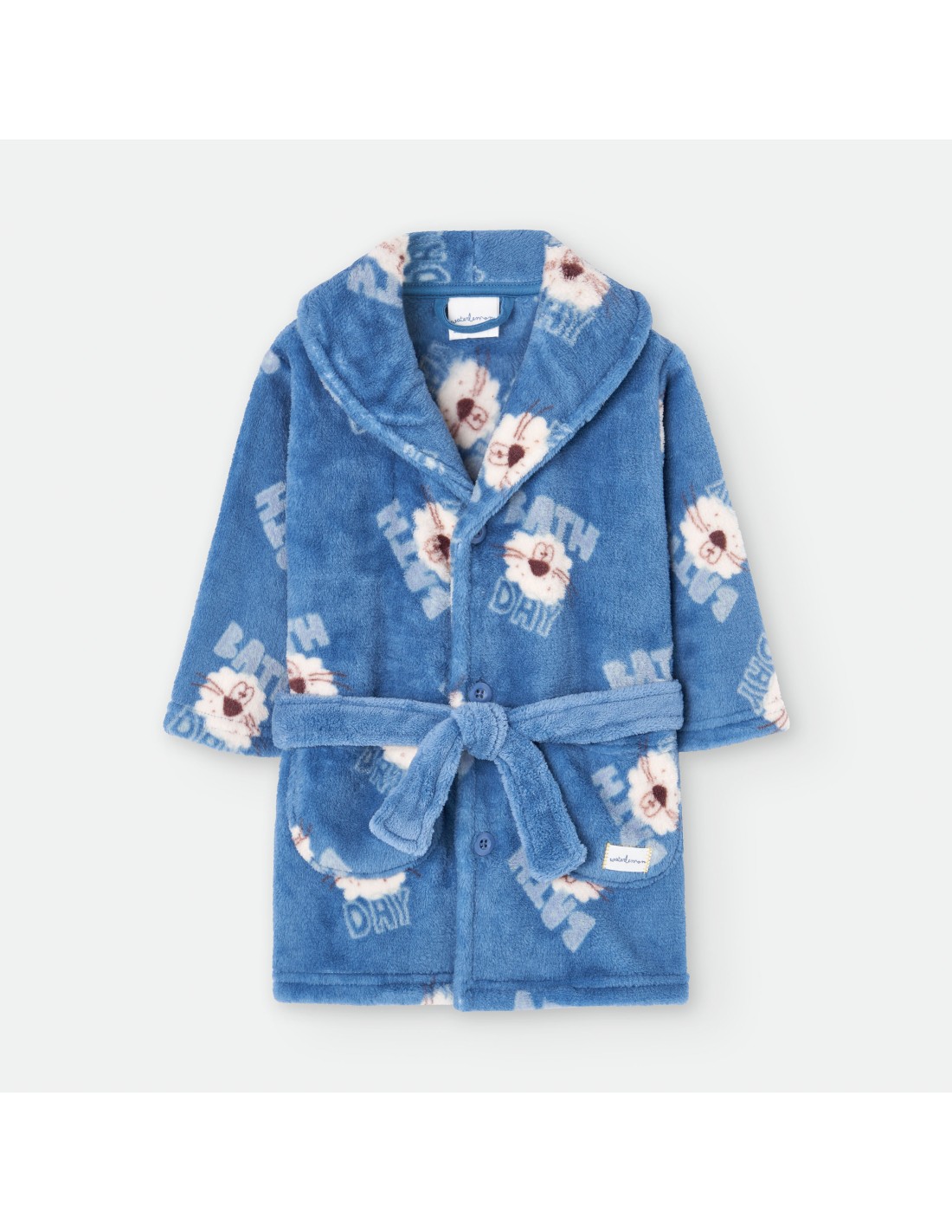 Bata de bebé para estar por casa de color azul con estampado de caritas de perro.