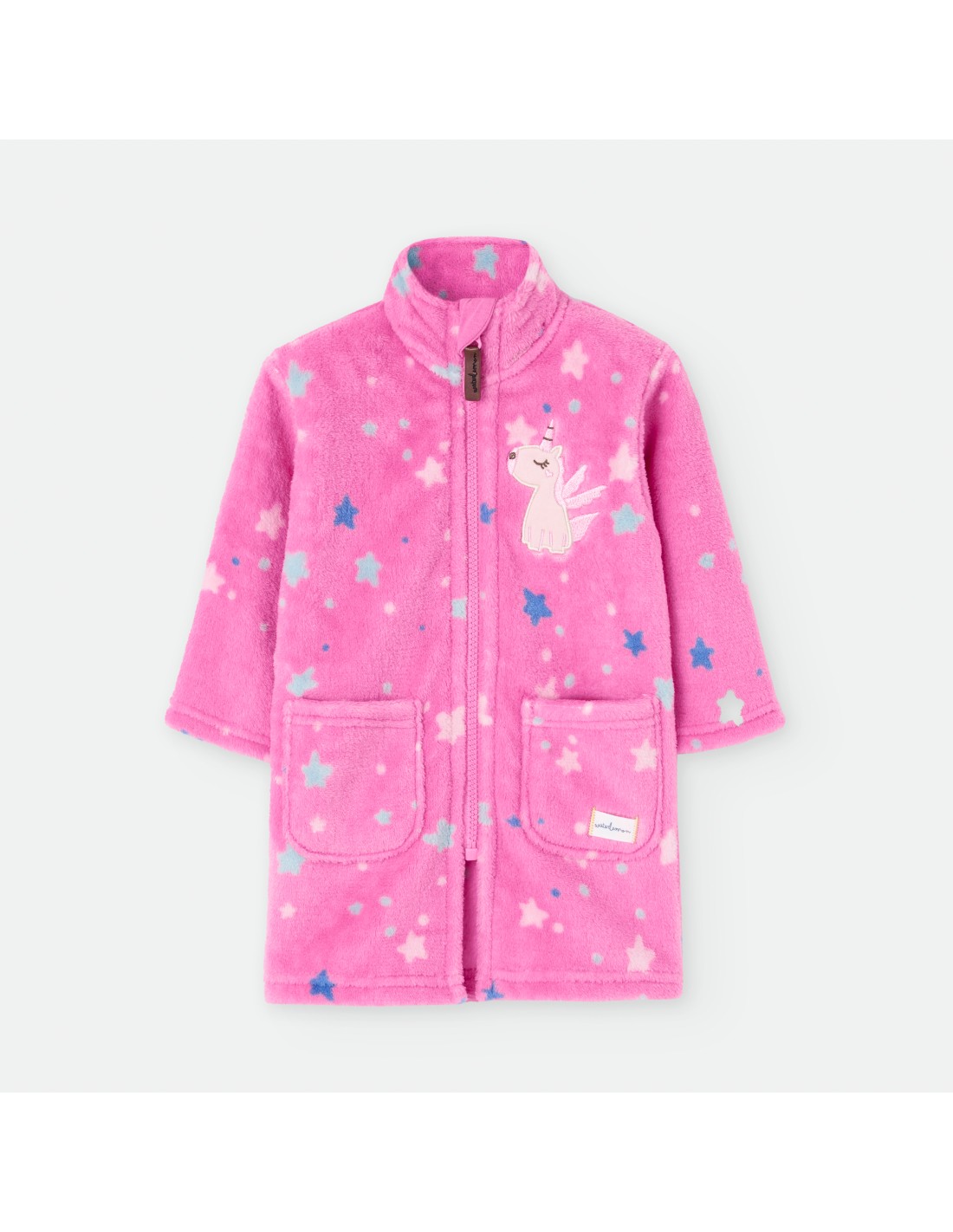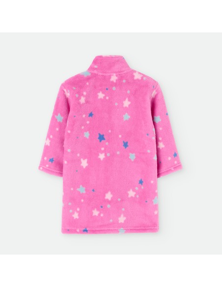 Bata de bebé para estar por casa de color rosa con estampado de estrellas y dibujo de unicornio.