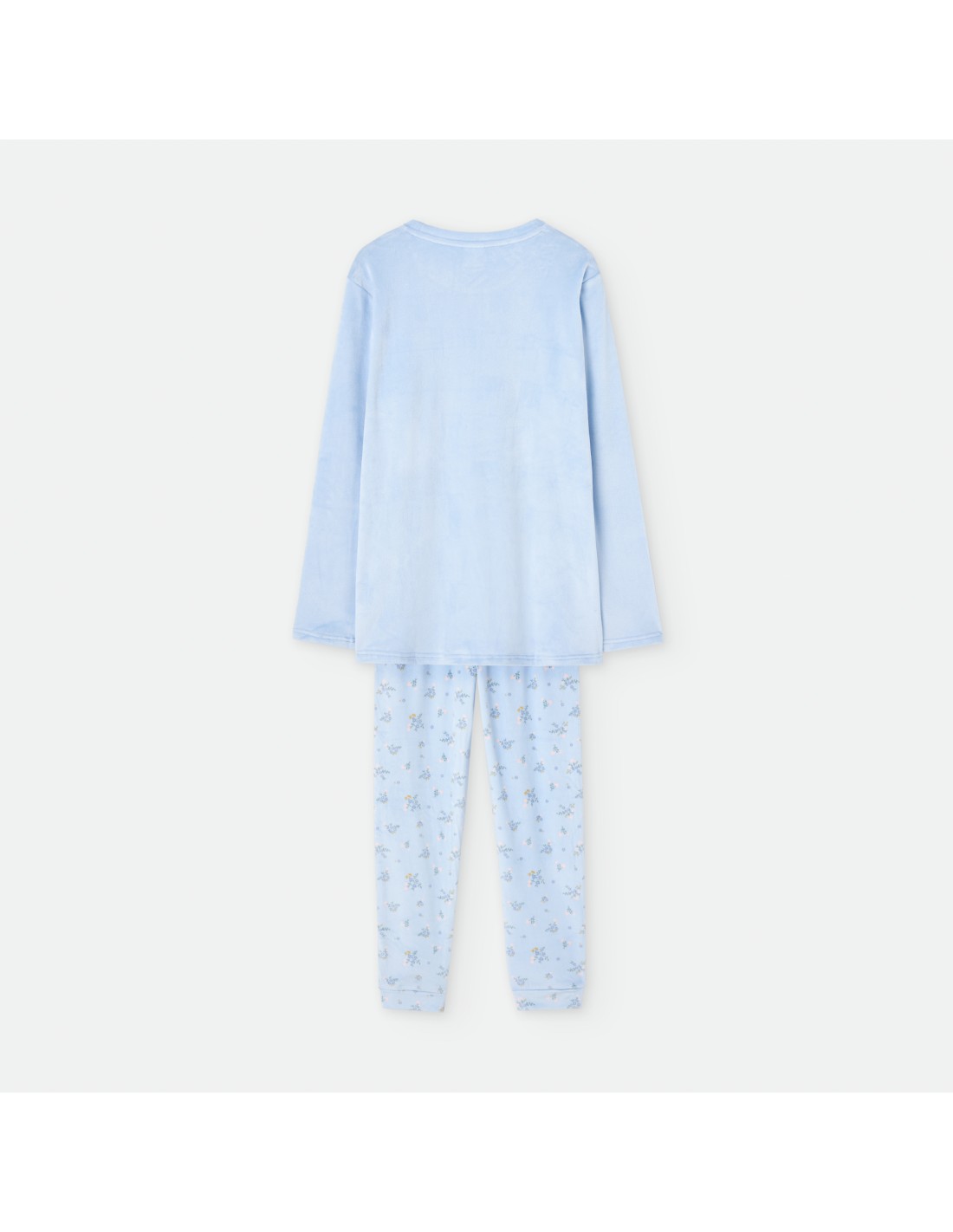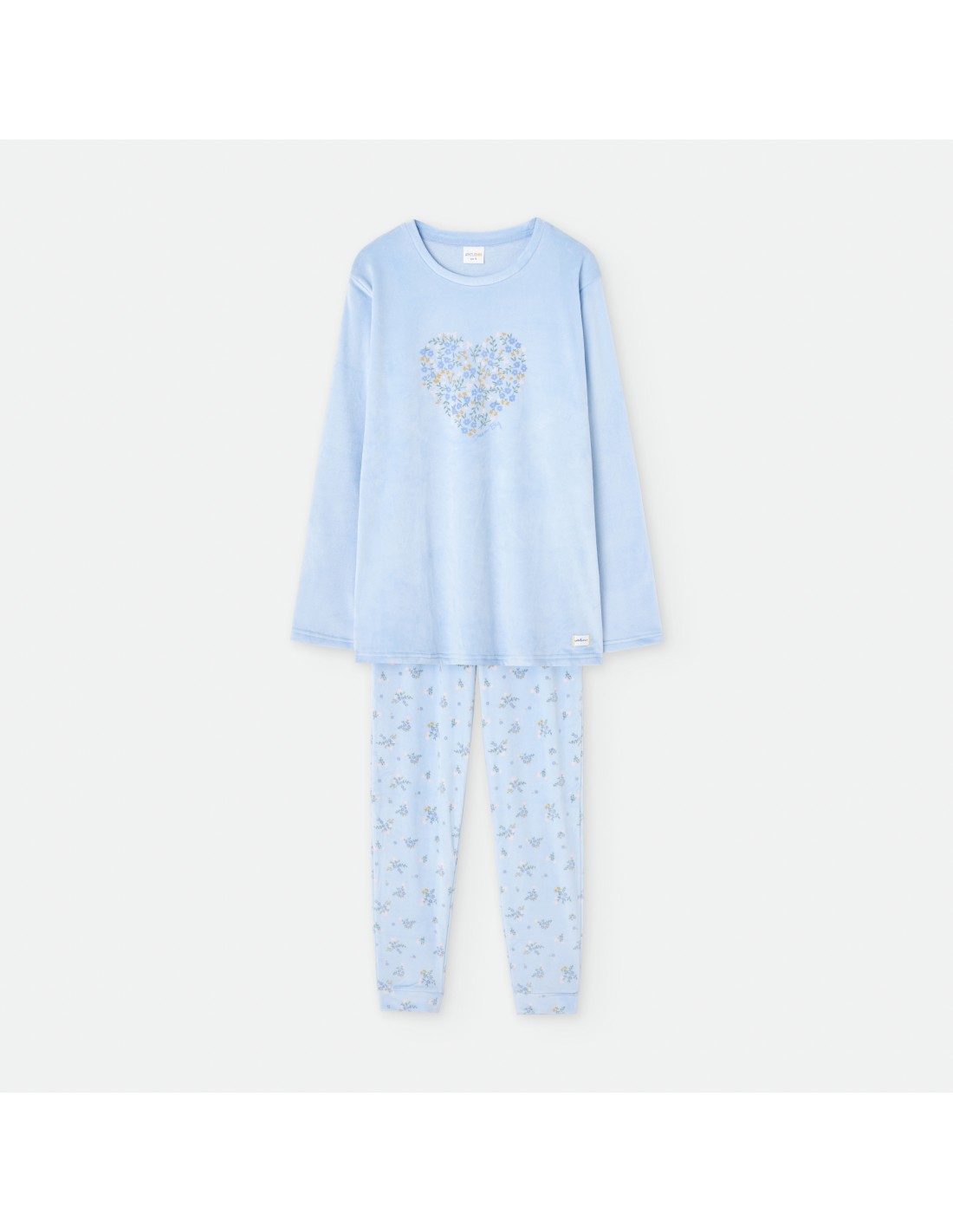 Pijama elástico de terciopelo para mujer compuesto por camiseta con dibujo de corazón de flores y pantalón estampado de ramilletes.