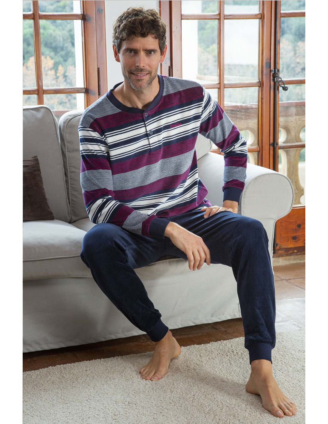 Pijama de hombre de terciopelo de marca Muslher compuesto por camiseta de rallas granate, azul y blanco con cierre de dos botones; y pantalones color azul marino lisos.