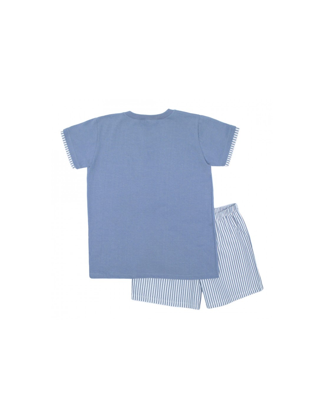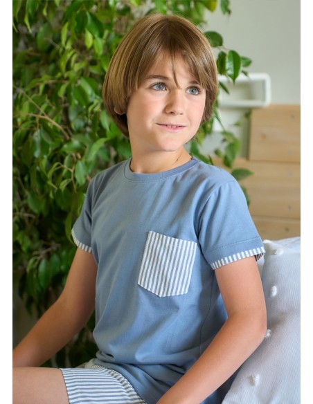 Pijama de comunión para niño compuesto por camiseta de manga corta de color azul con bolsillo a rayas y pantalón corto a rayas.