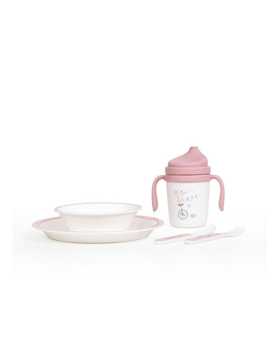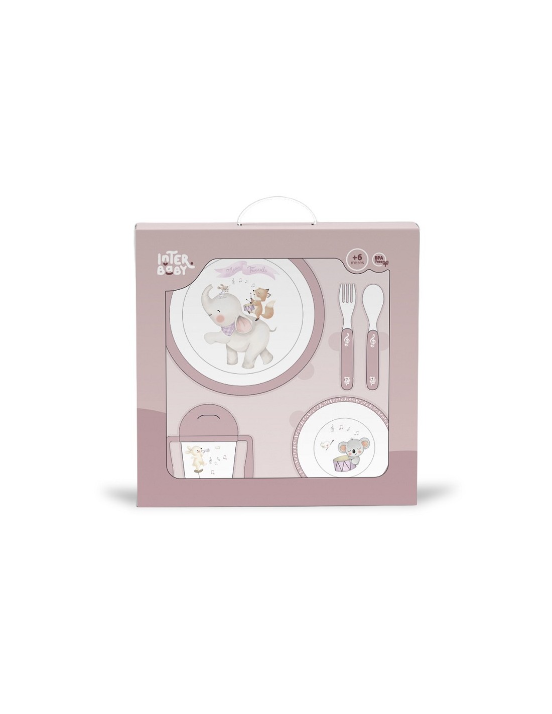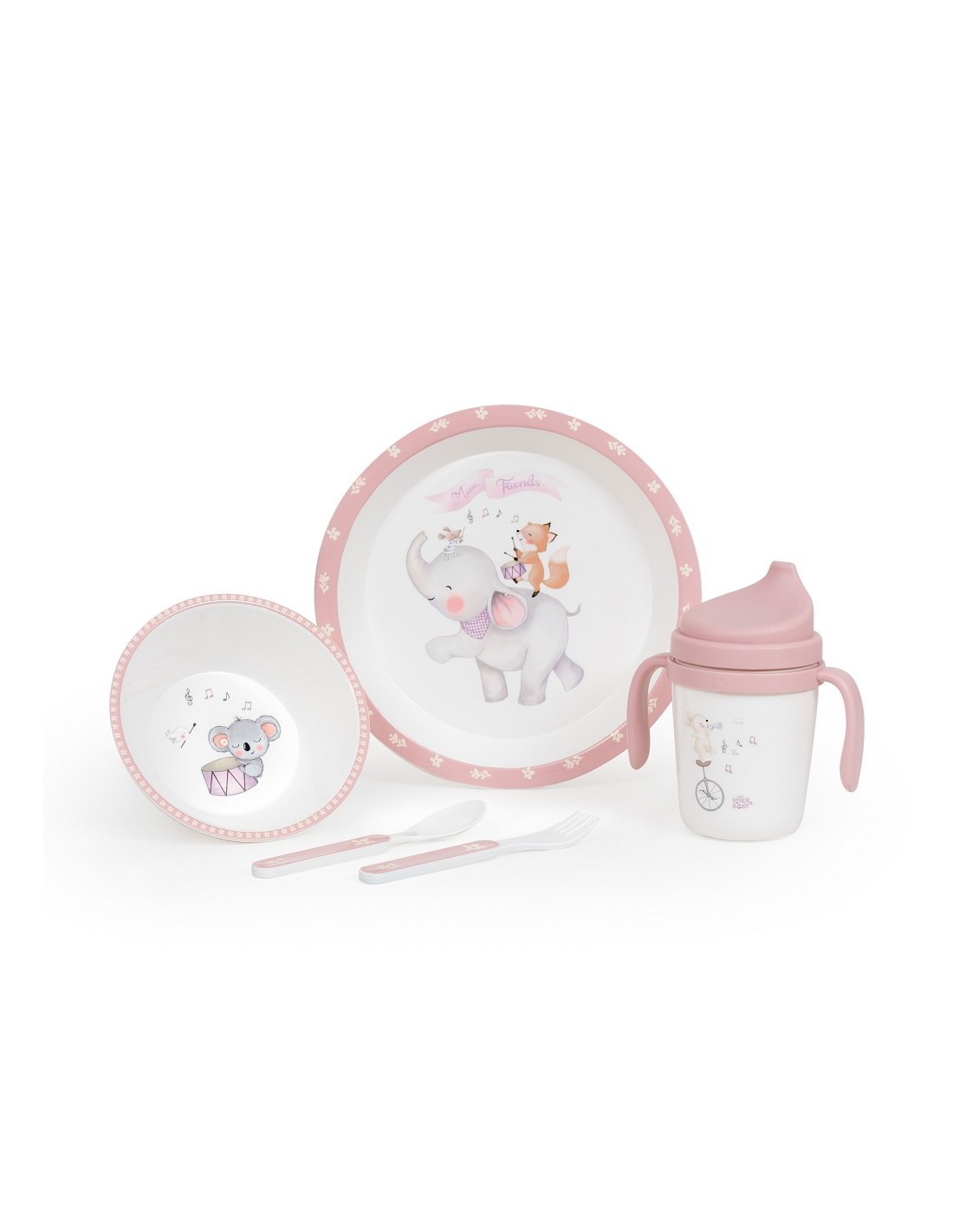 - Plato grande con borde rosa y dibujos de animales músicos.