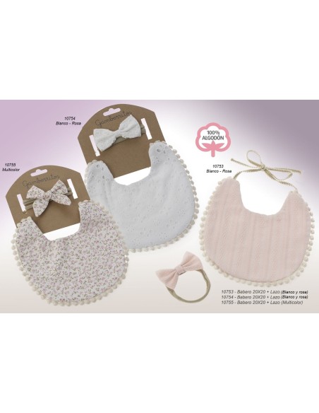 Babero pequeño de bebé con estampado de flores y diadema con lacito a juego.