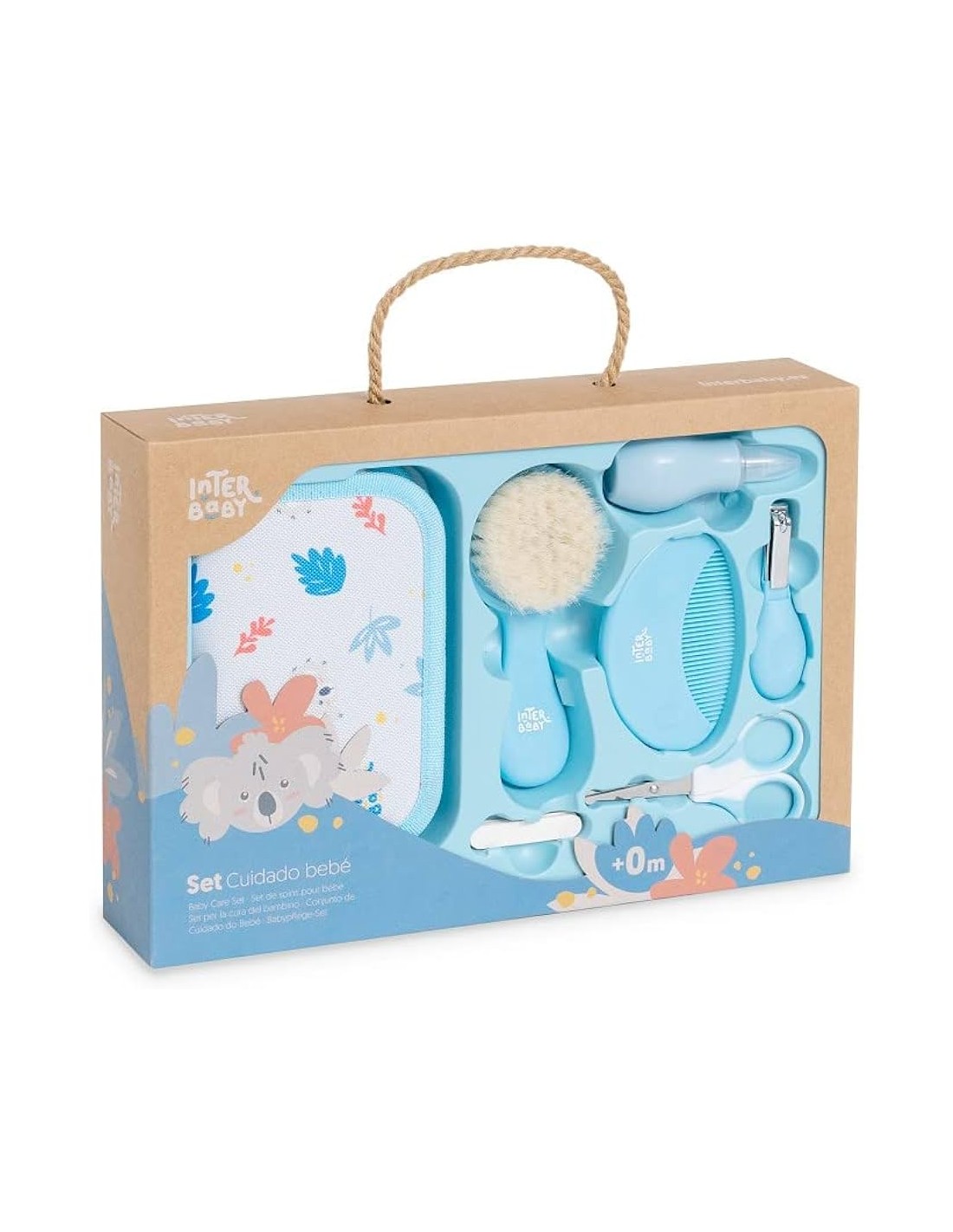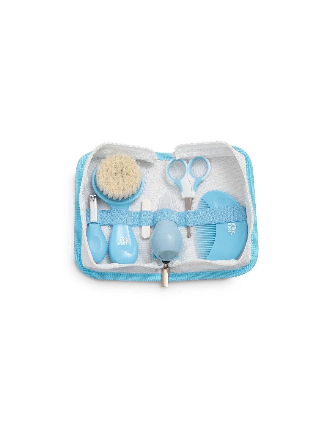 Set de cuidado del bebé compuesto por: estuche impermeable, cepillo de cerdas, limas para uñas de recién nacido, aspirador nasal desmontable, peine de puntas redondeadas, tijeras de punta redondeada y cortauñas ergonómico.