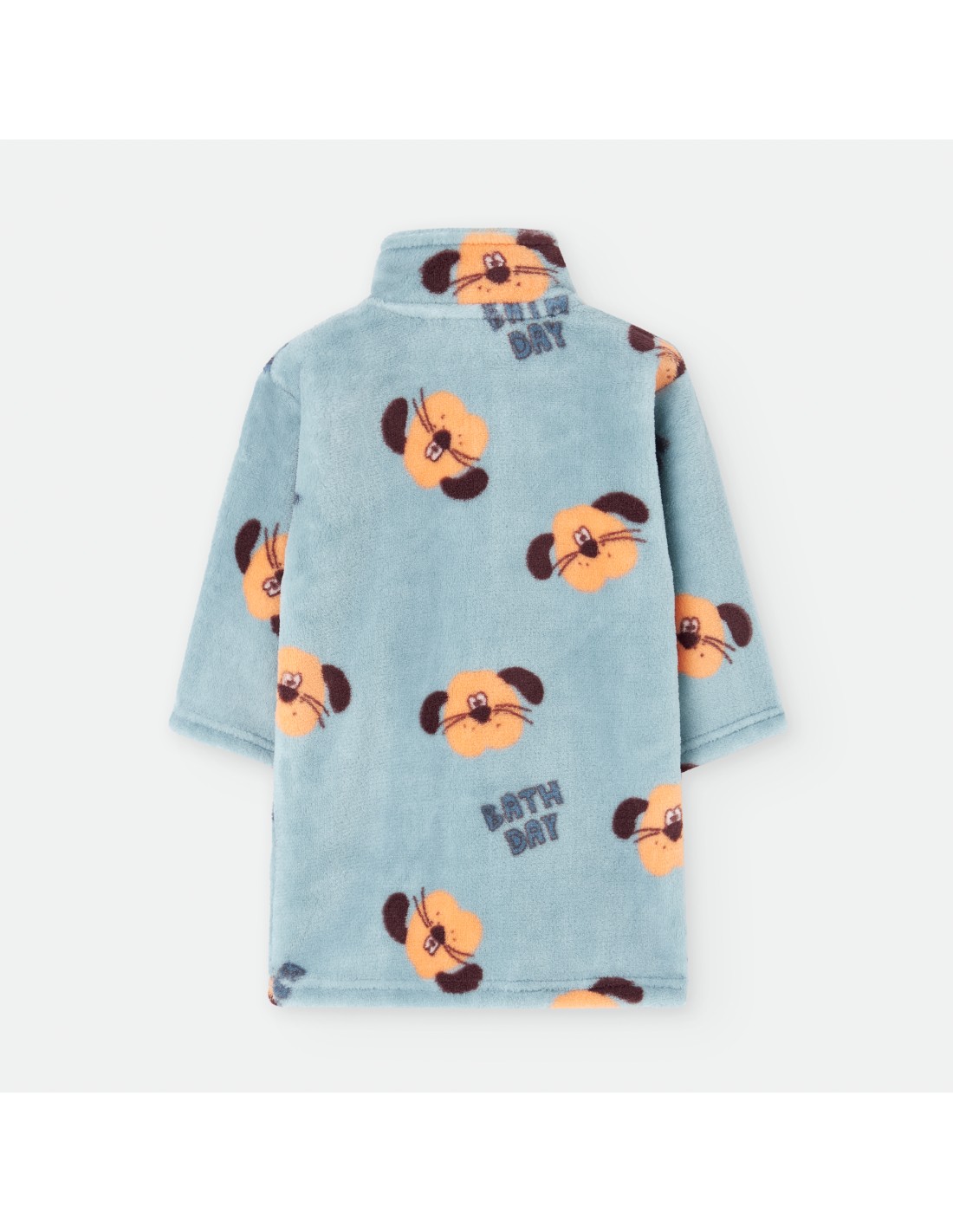 Bata infantil para estar por casa de color aguamarina con estampado de caritas de perro.