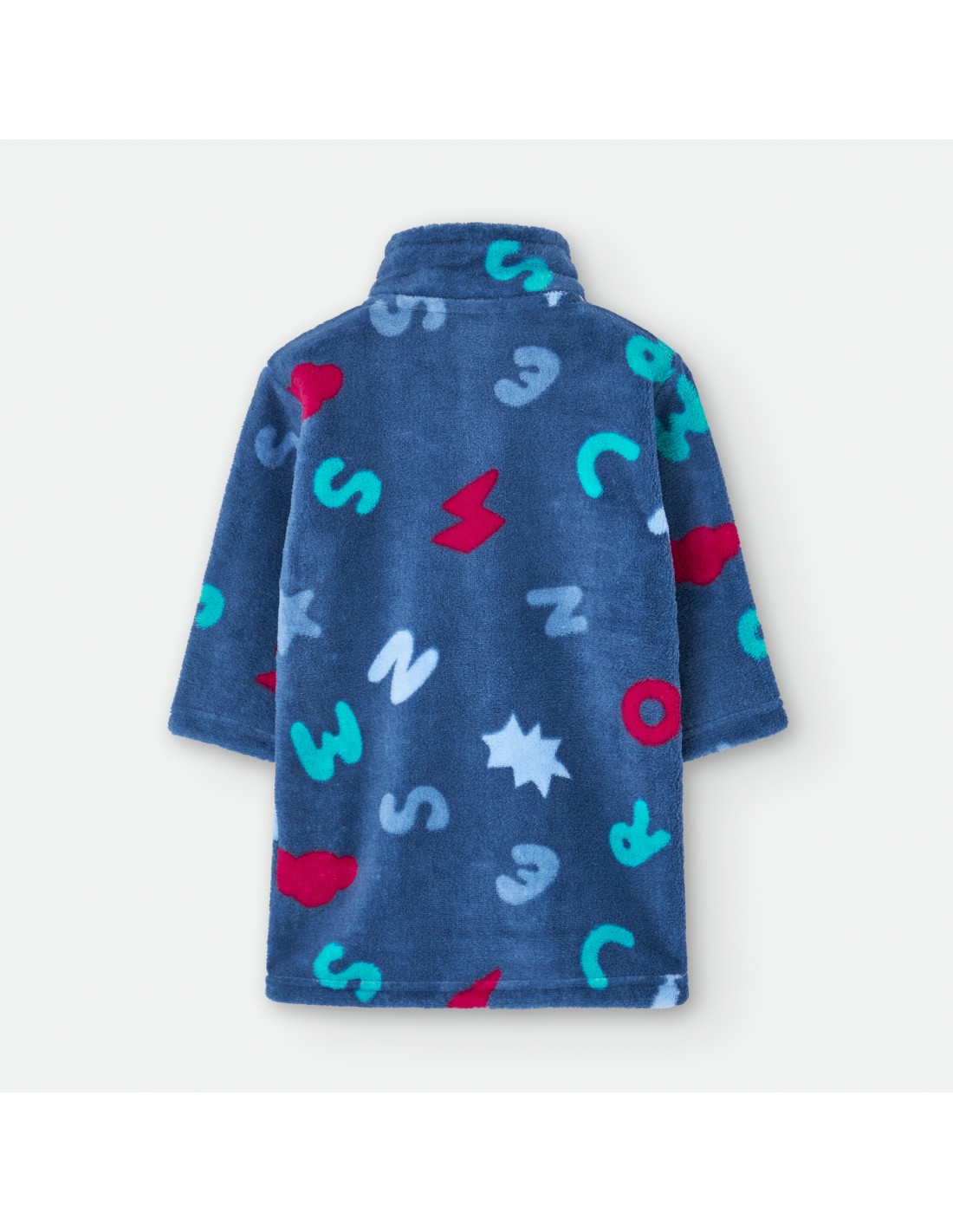 Bata infantil para estar por casa de color azul oscuro con estampado de letras.
