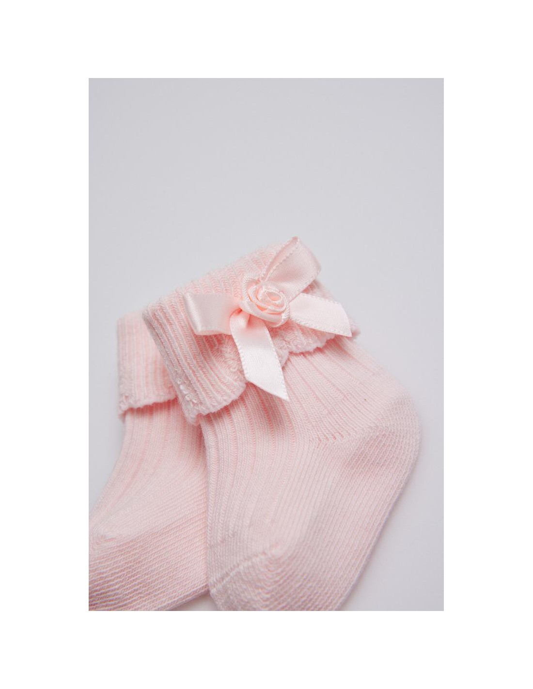 Calcetín básico recién nacido. Tejido en suave algodón canalé, se ajusta ergonómicamente al pie del bebé evitando que deslice. Cuidado prenatal asegurado con el doble puño especial antipresión. Decorados con lazo de raso, estos dulces calcetines son el confort necesario para los más pequeños de la casa.