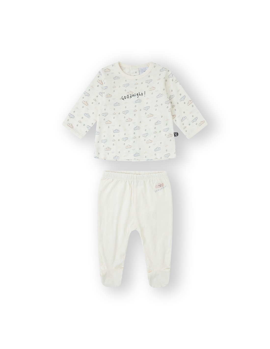 Conjunto de 2 piezas compuesto por camiseta de color crudo estampado de nubes y polaina lisa de color crudo con pequeño dibujo de nube.