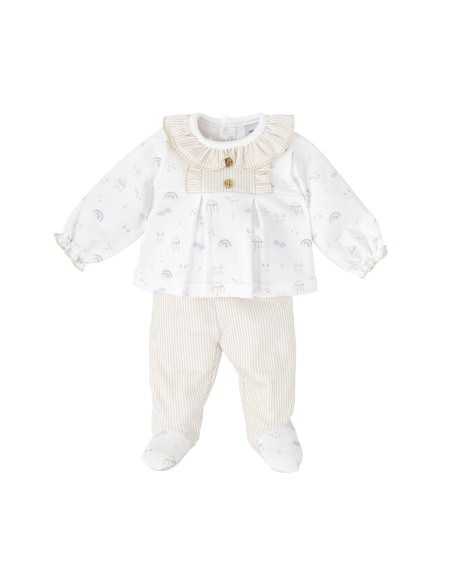 Conjunto de 2 piezas para bebé compuesto por camiseta de color arena con cuello de volantes, estampado de motivos infantiles y polaina rayas.