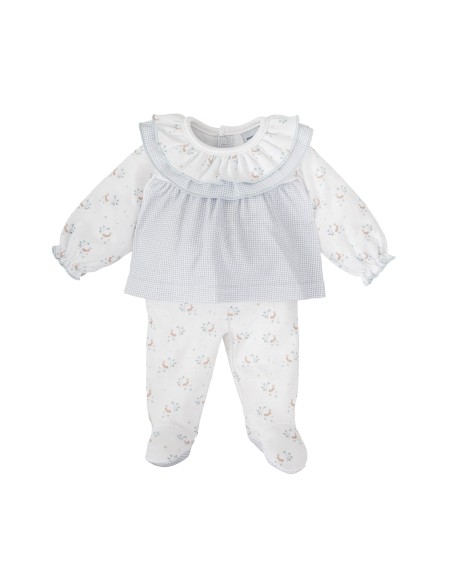 Conjunto de 2 piezas para bebé compuesto por camiseta a cuadros con cuello de volante y mangas estampadas; y polaina a juego.
