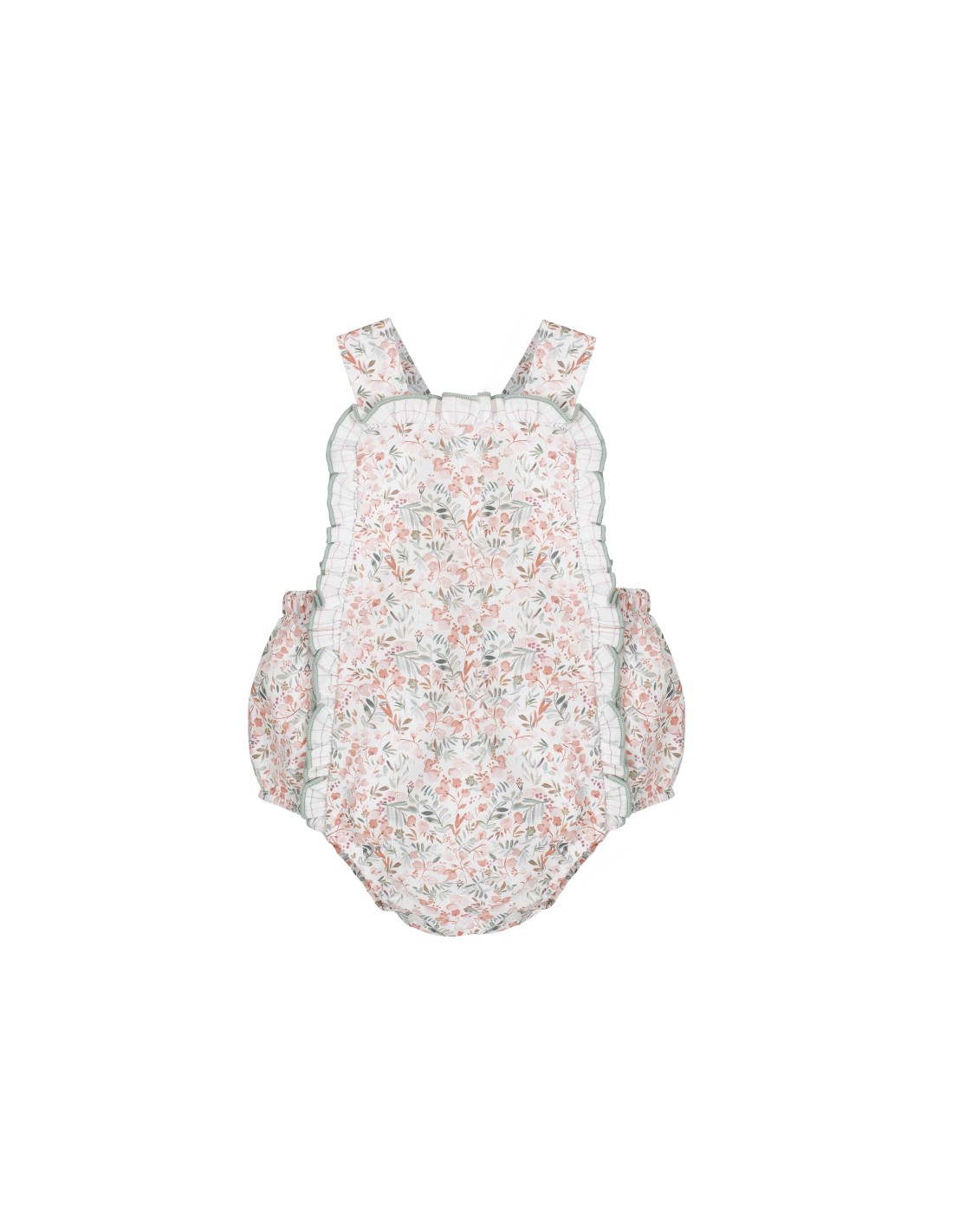Peto de tirantes para bebé para bebé con volantes laterales y estampado de flores.