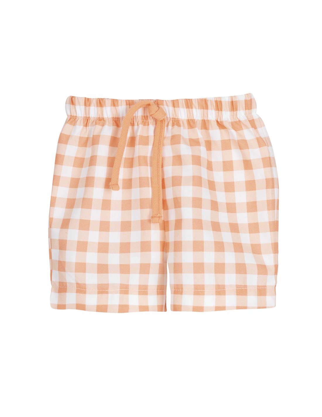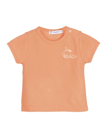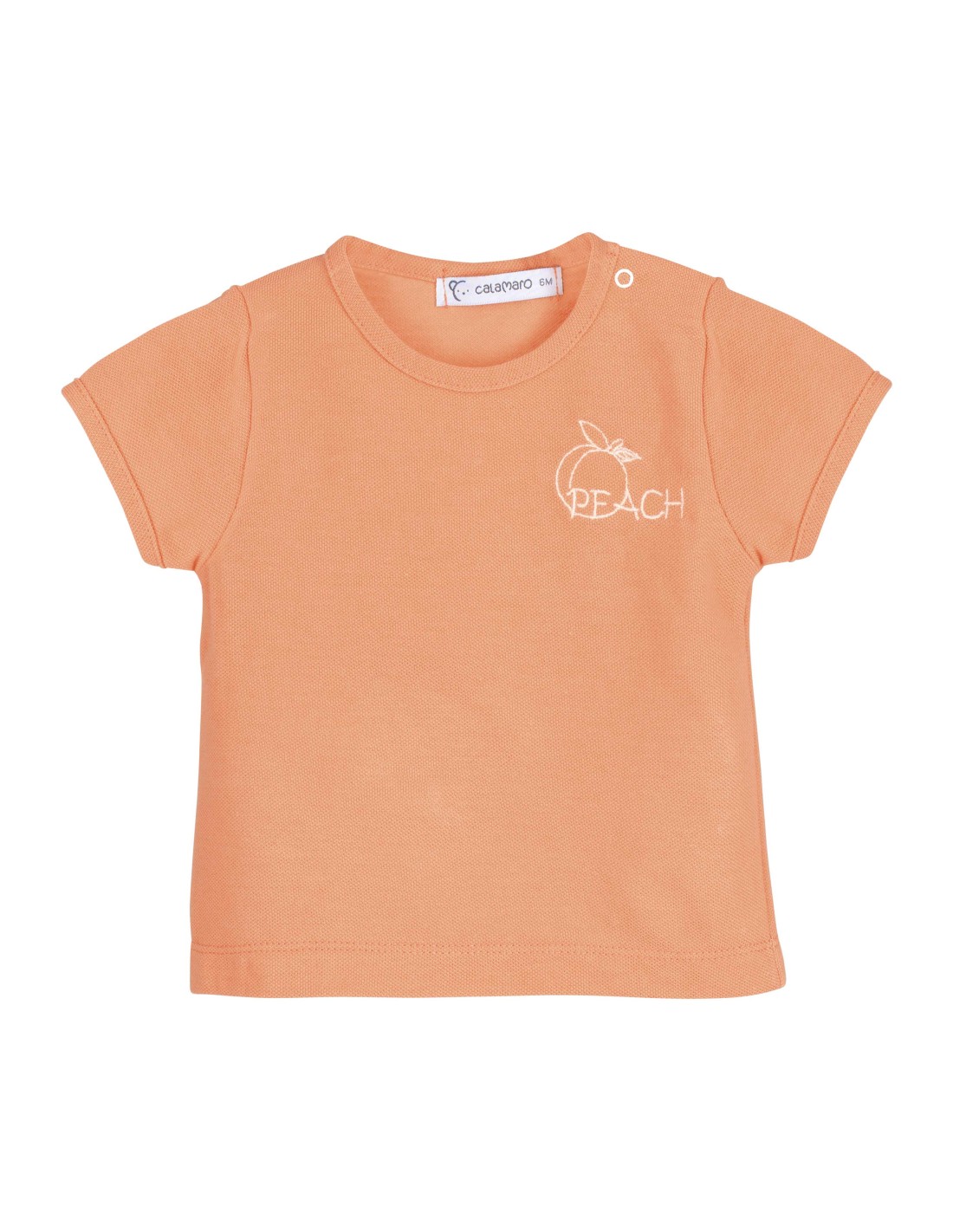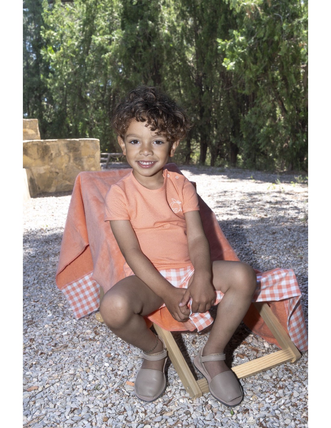 Conjunto de pantalón para bebé compuesto por pantalón a cuadros y camiseta de color melocotón con pequeño dibujo bordado de melocotón.