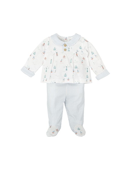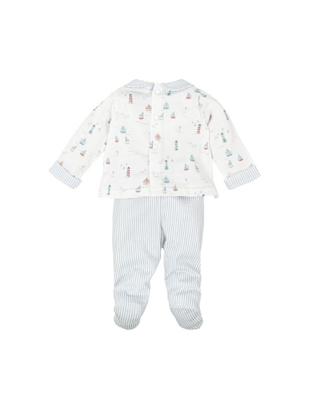 Conjunto de 2 piezas para bebé compuesto por camiseta estampada de motivos marinos y cuello a rayas; y polaina a rayas.
