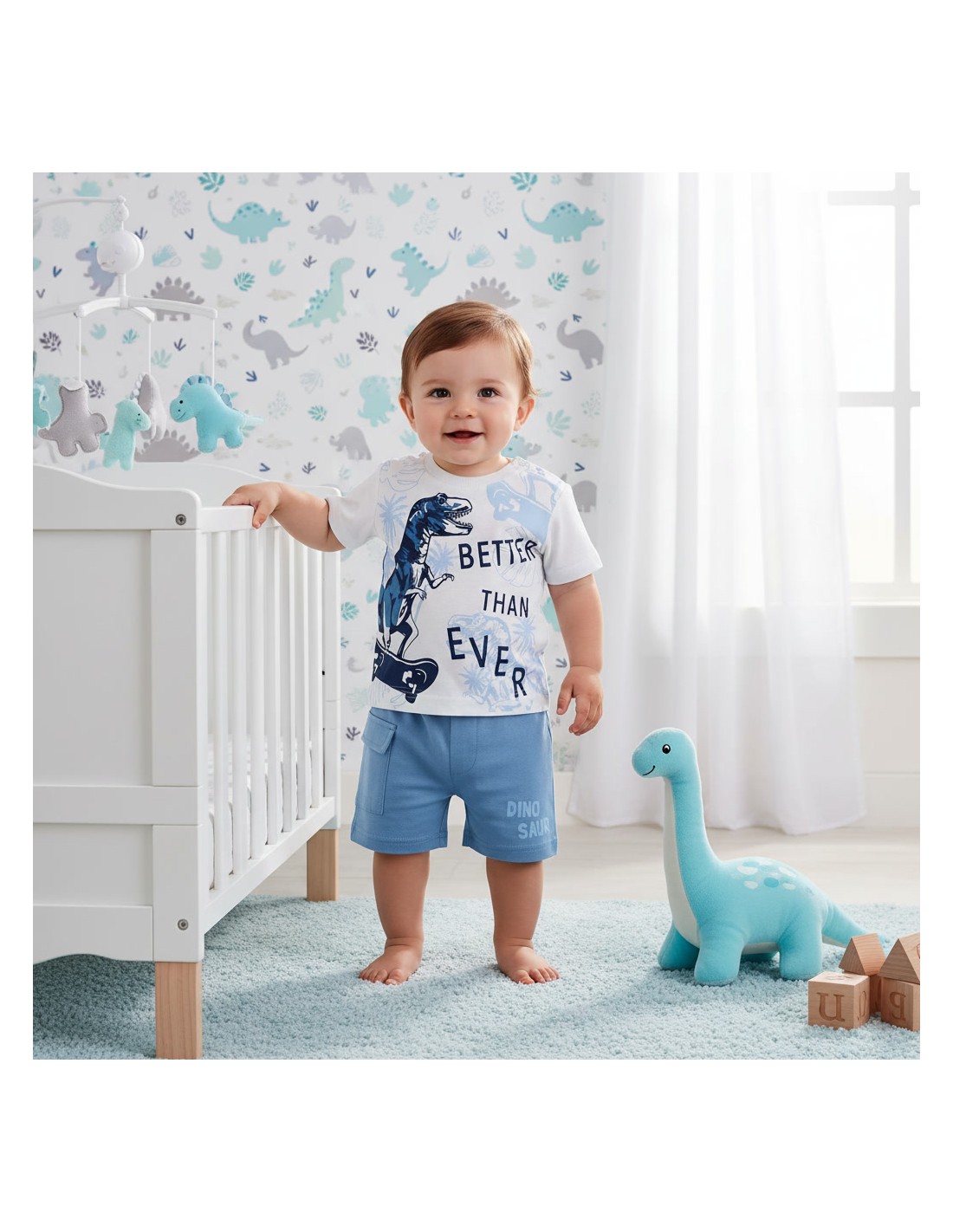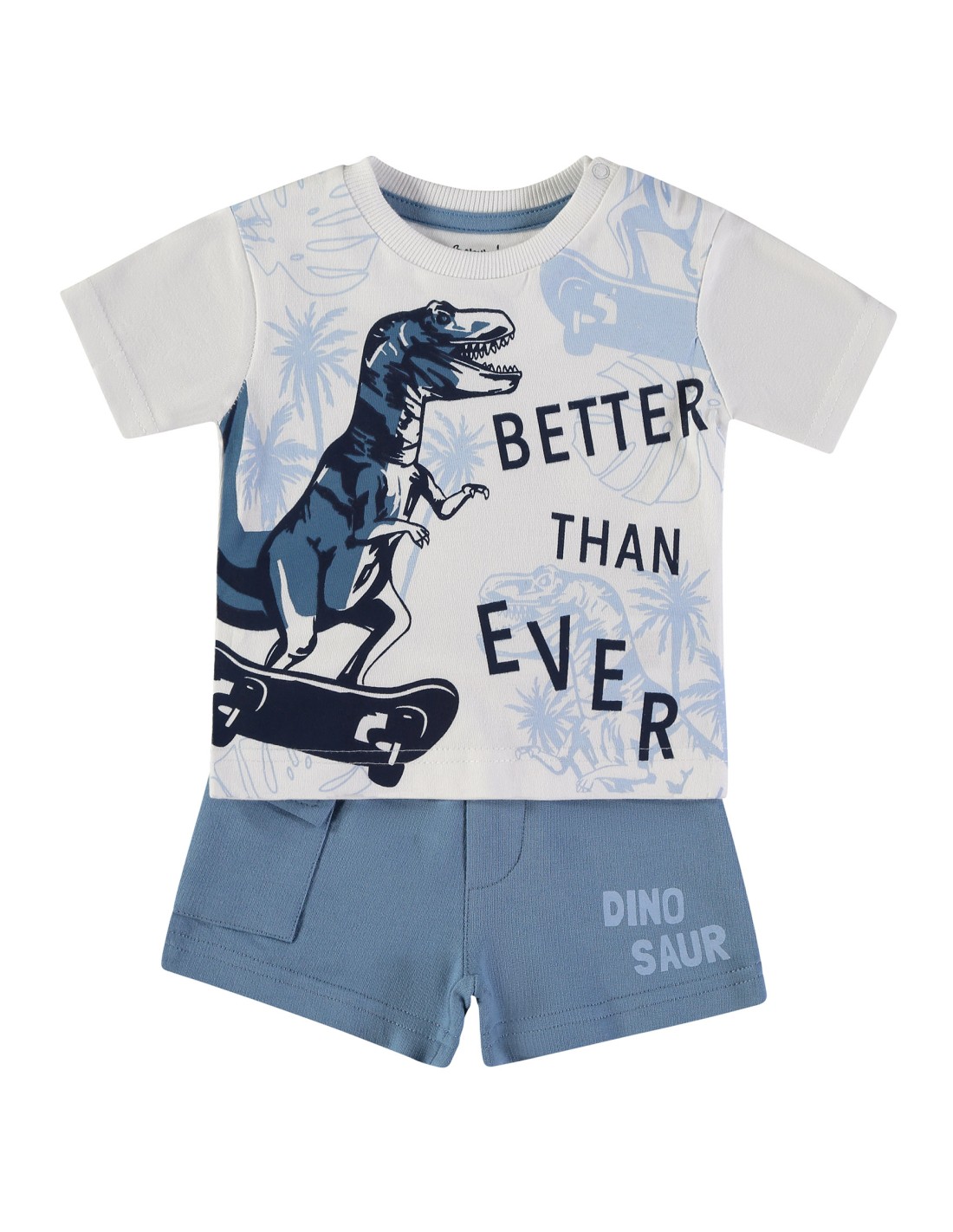 Conjunto de pantalón para bebé compuesto por pantalón liso de color azul con bolsillo y camiseta con dibujo de dinosaurio con monopatín.
