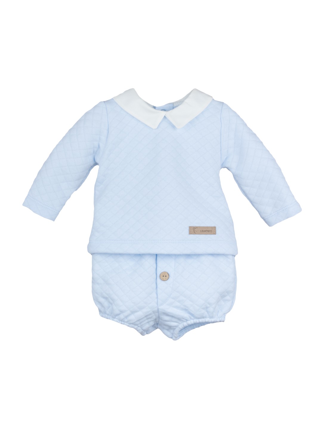 Conjunto de pololo modelo Sil con 2 piezas para bebé. Compuesto por camiseta de color celeste con cuello blanco; y pololo de color celeste con botón de madera decorativo.