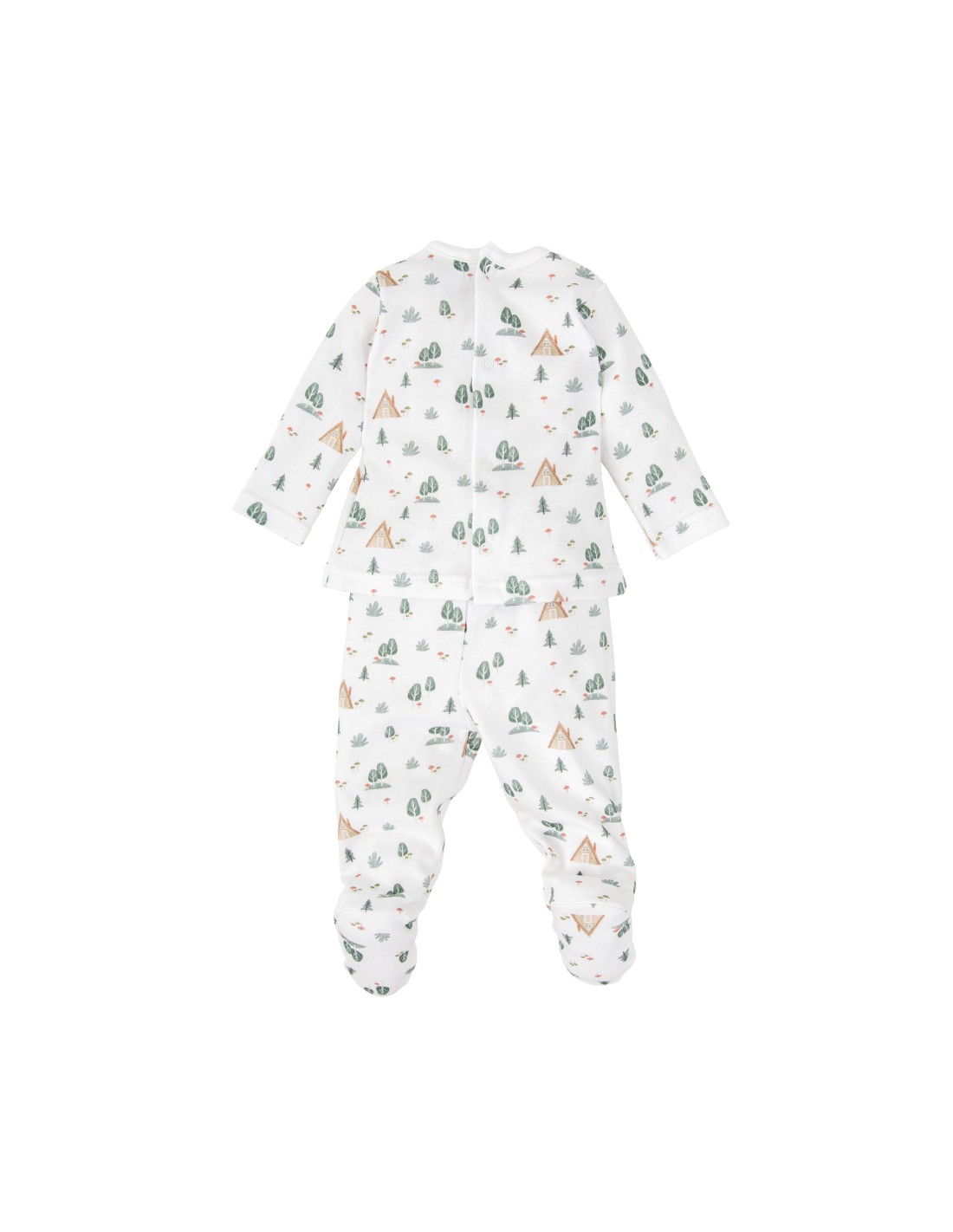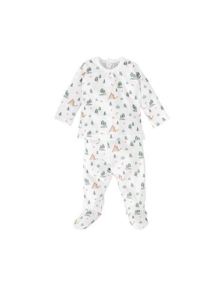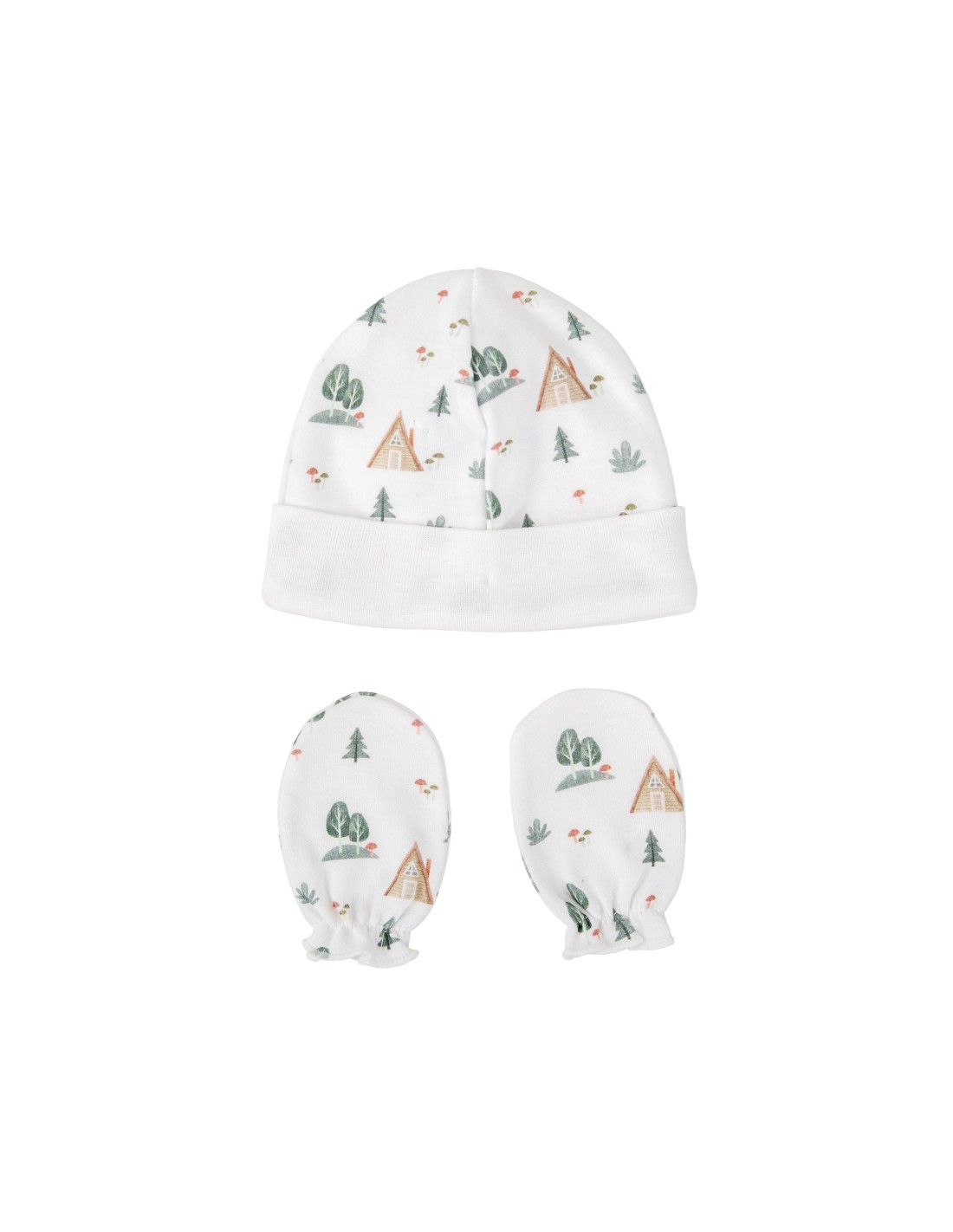 Pack de regalo para bebé compuesto por: jubón y polaina estampados de bosque, body, gorrito y manoplas a juego.