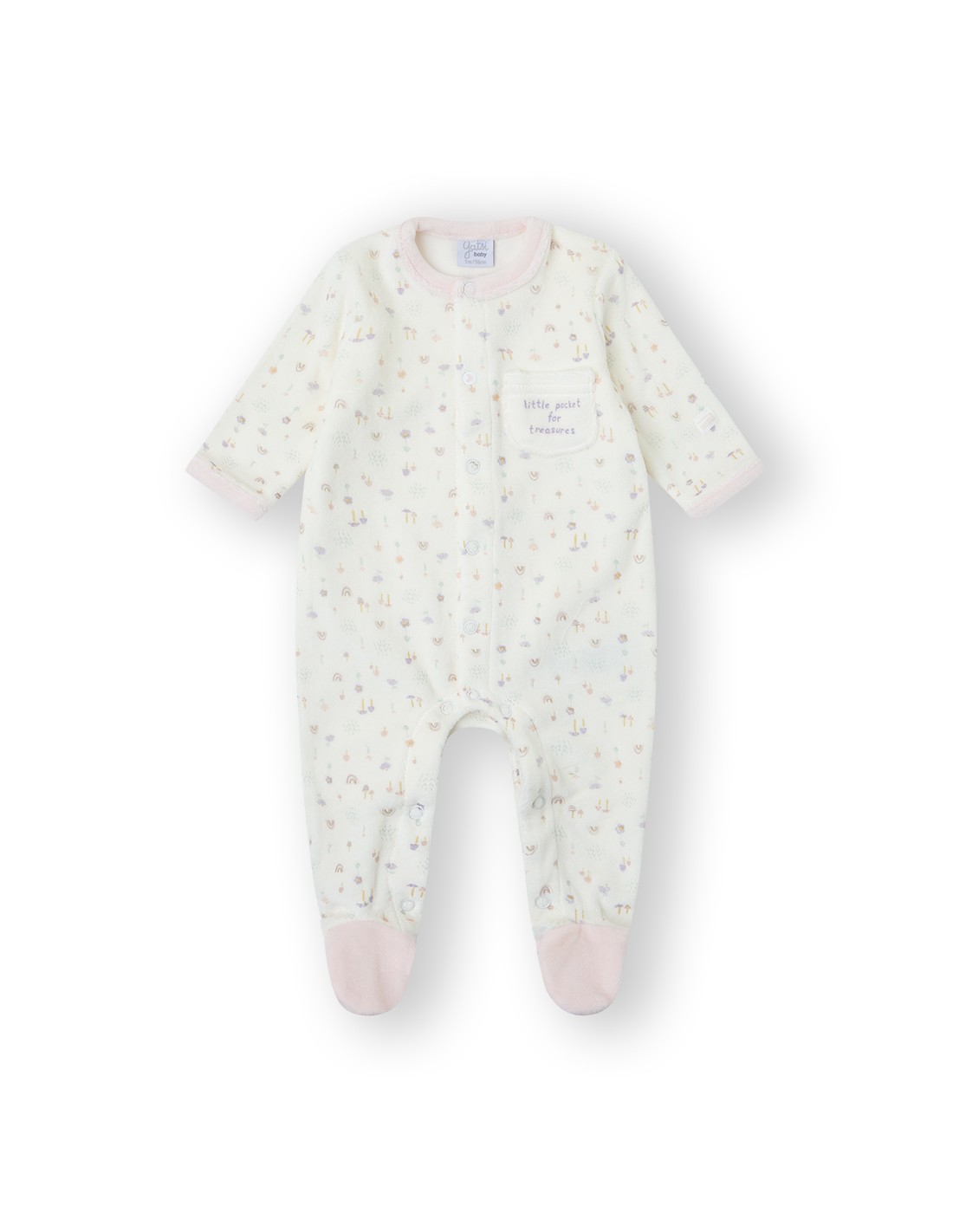 Pelele para bebé de la marca Yatsi. De color crudo con estampado infantil y pequeño bolsillo.