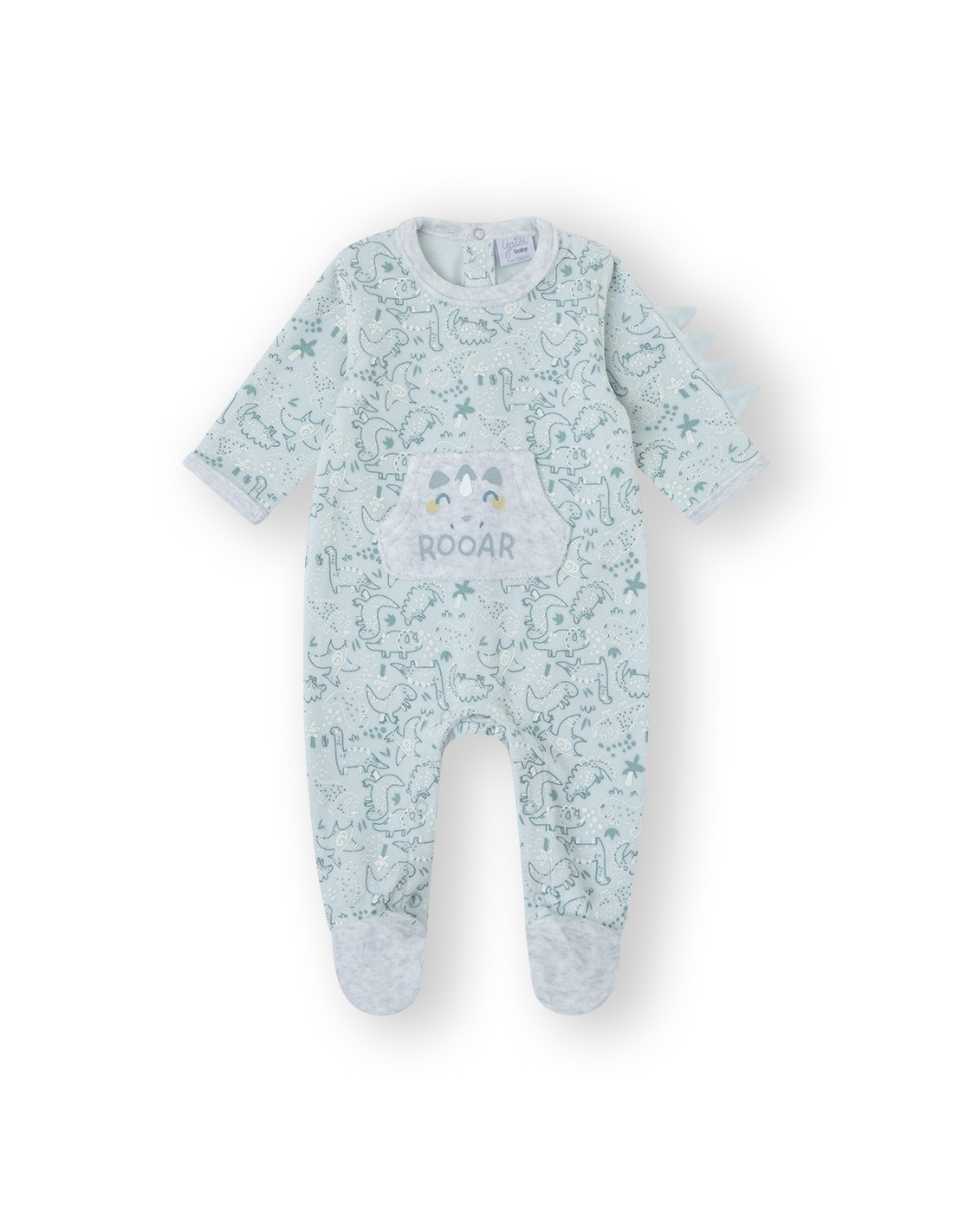 Pelele para bebé de la marca Yatsi. De colorverde con estampado de dinosaurios y bolsillo central con cara de dino.