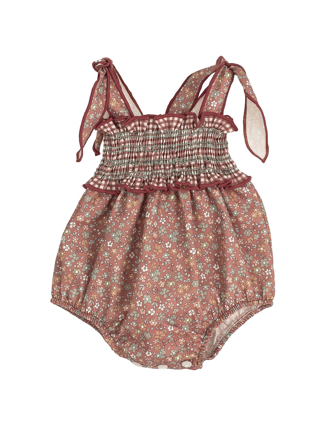 Pelele de tirantes modelo Siroco para bebé. De color terracota con parte superior fruncida y resto del pelele estampado de flores. Tirantes con nudo.