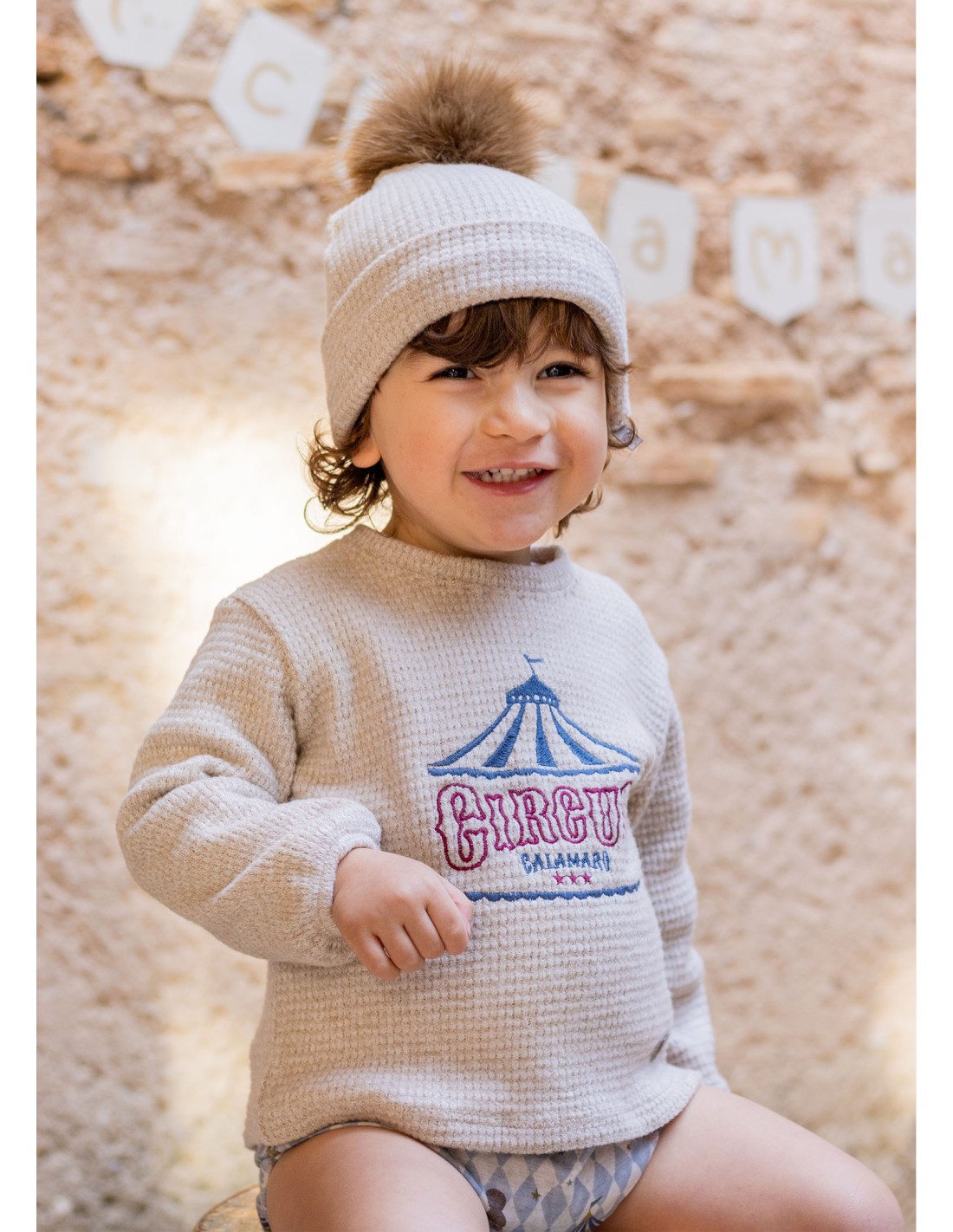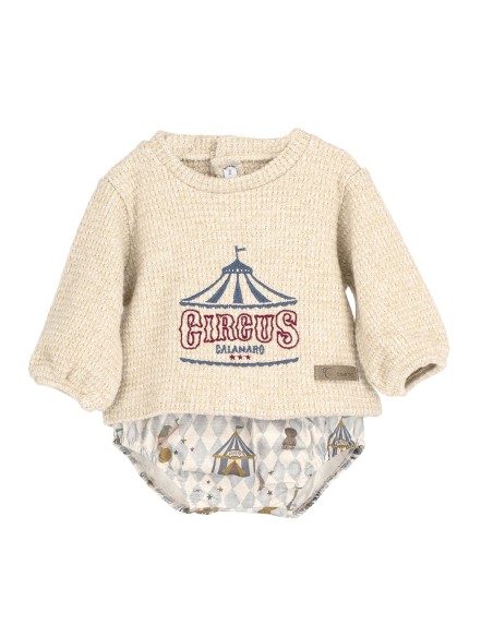 Conjunto de pololo modelo Mistral con 2 piezas para bebé. Compuesto por camiseta de color crudo con dibujo de circo y pololo de color azul estampado de circo.