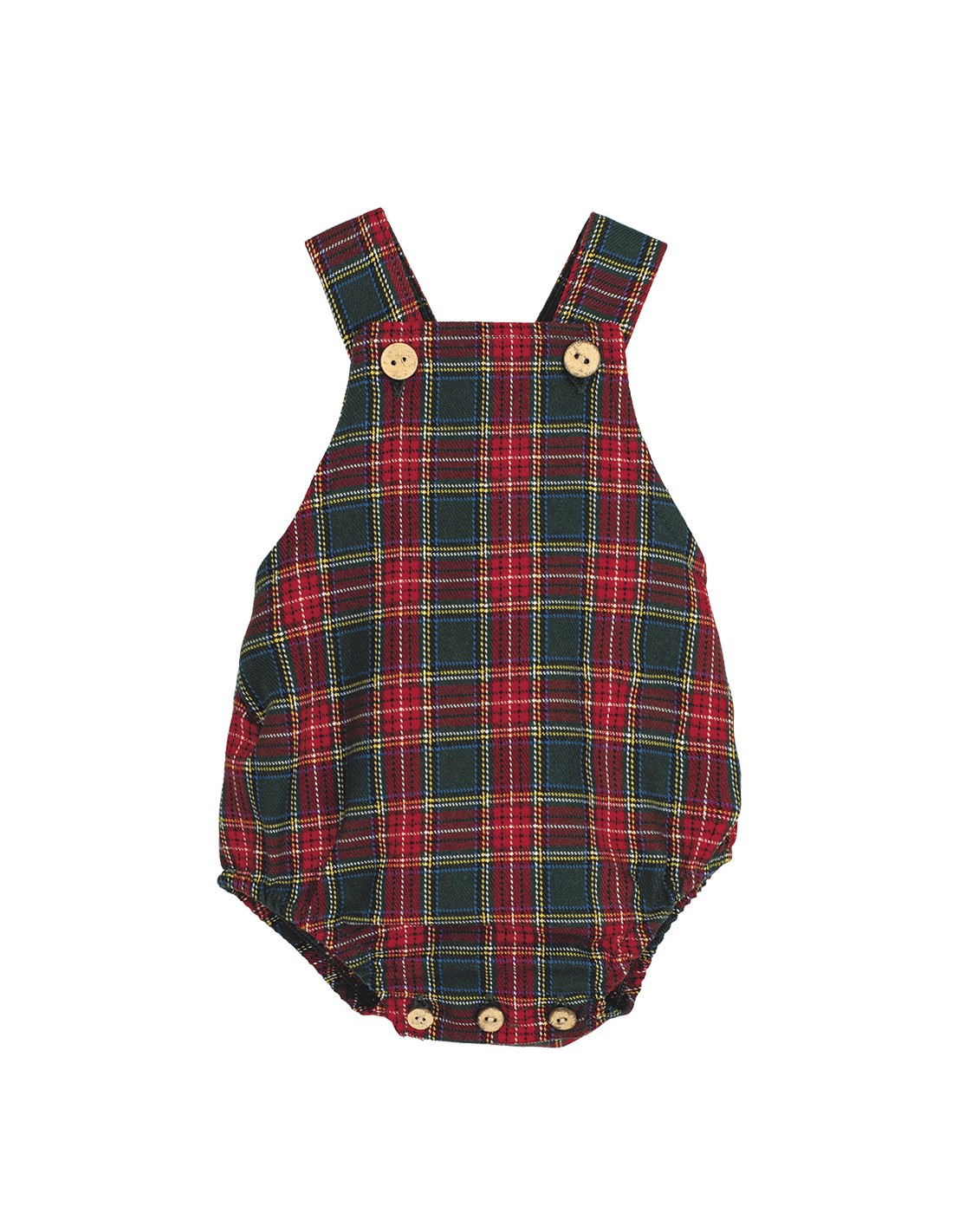 Peto modelo Galerna para bebé. A cuadros de color granate y verde, estilo navideño.