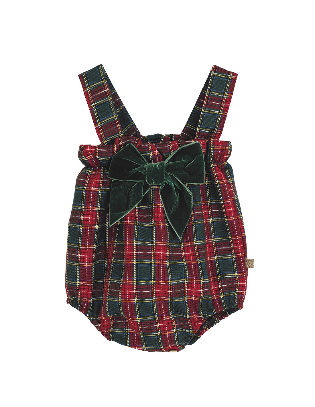 Peto modelo Galerna para bebé. A cuadros de color granate y verde con lazo, estilo navideño.