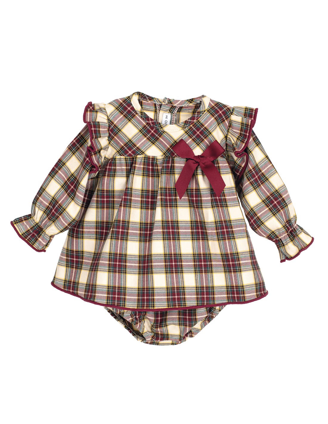 Jesusito modelo Boreas con 2 piezas para bebé. Compuesto por vestido a cuadros con volantes en mangas y lazo; y braguita a juego.
