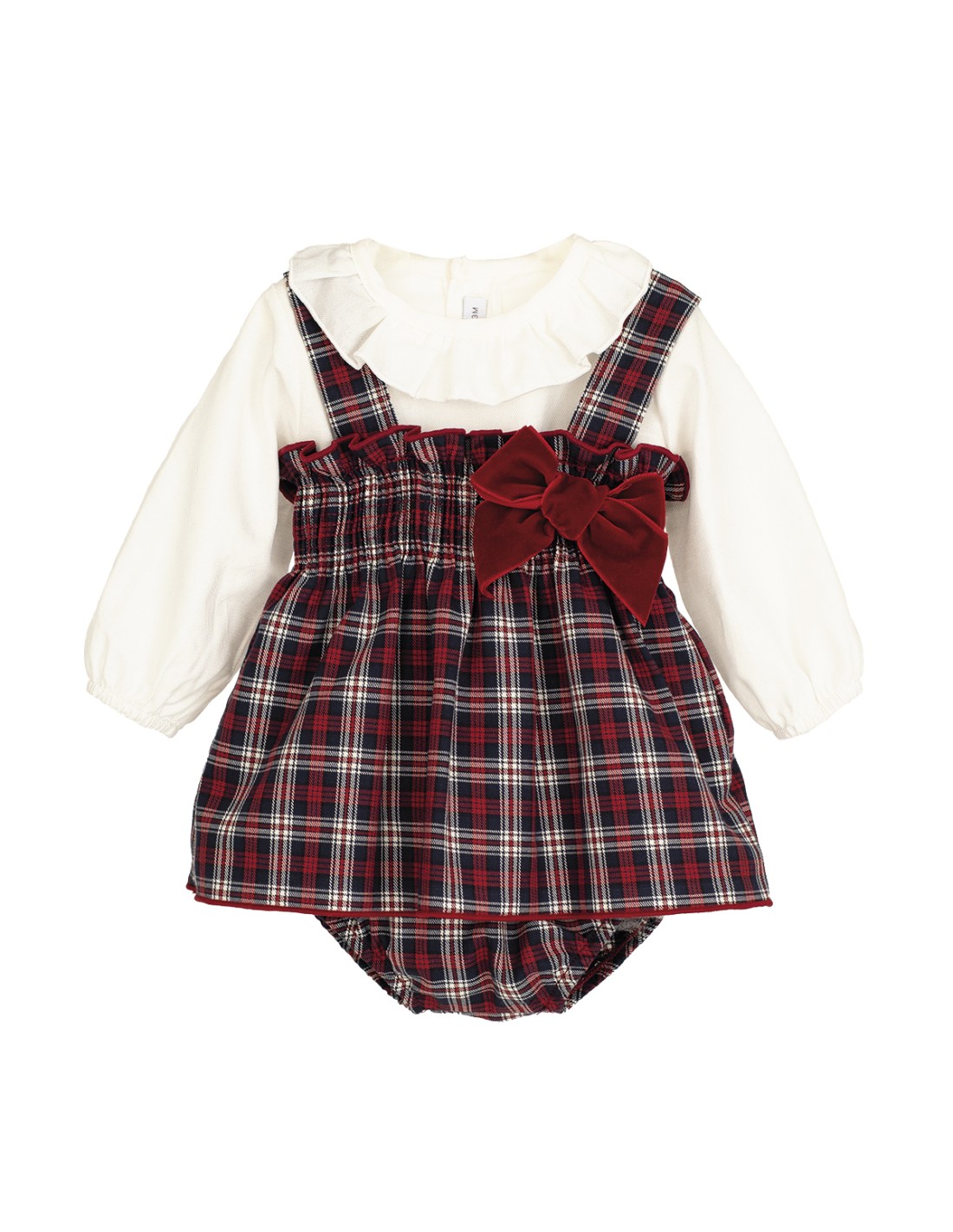 Jesusito modelo Monzón con 3 piezas para bebé. Compuesto por vestido de tirantes a cuadros con lazo, camiseta con cuello de volantes y braguita a juego.