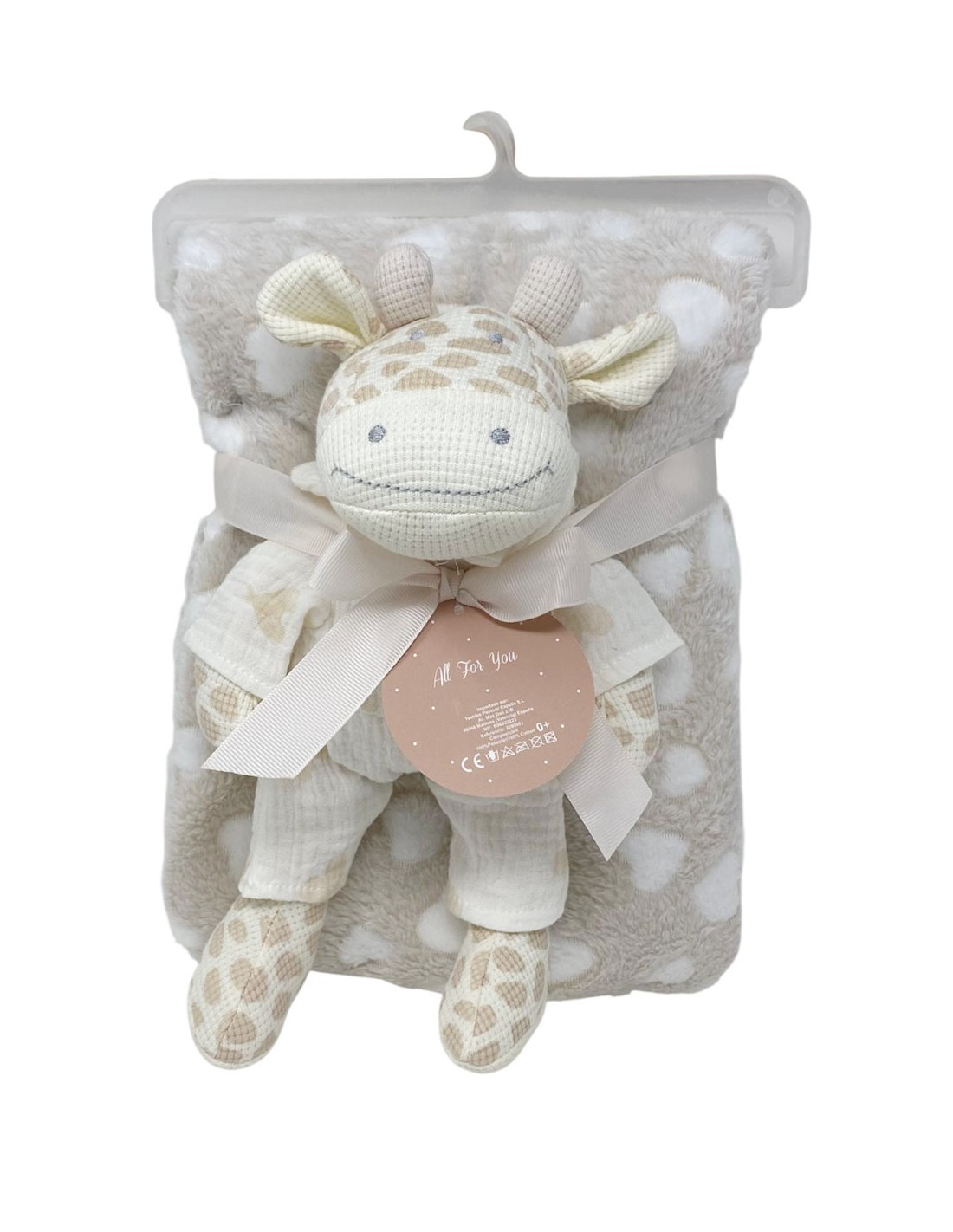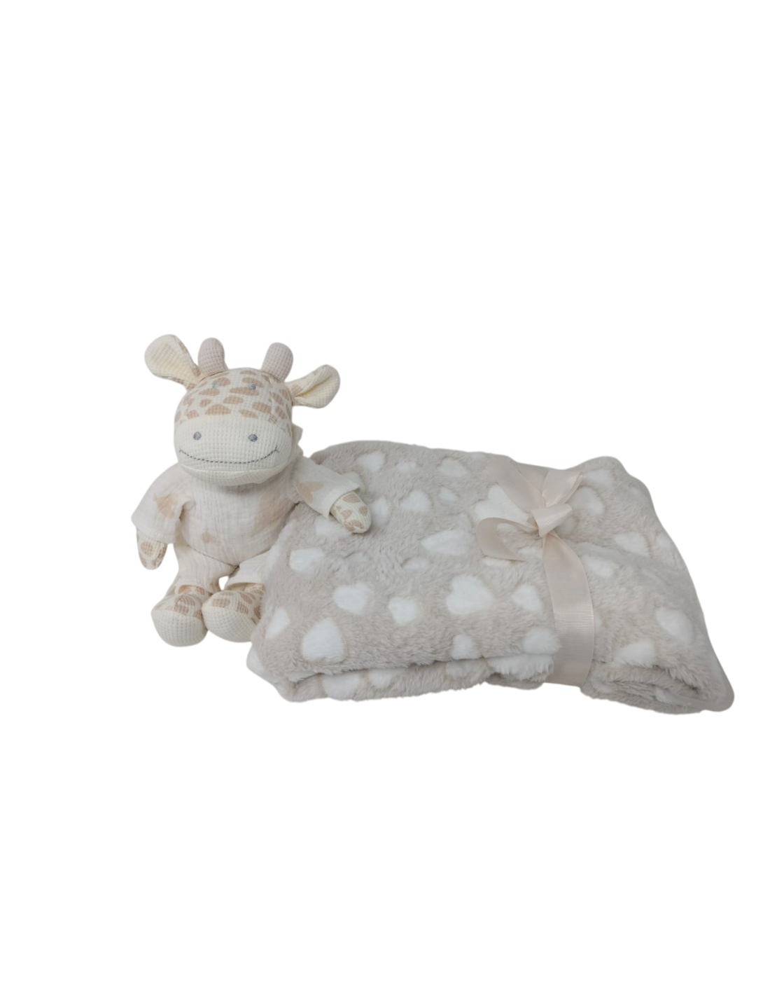 Set de regalo para bebé compuesto por: peluche de crochet con forma de jirafa y manta estampada de corazones.