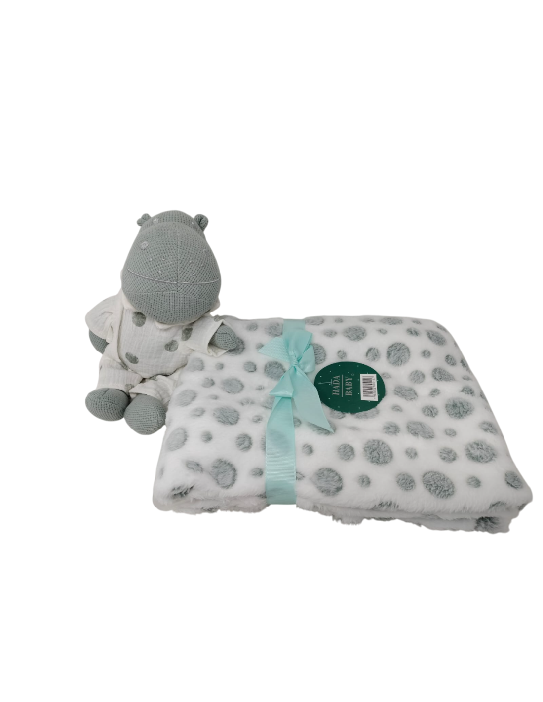 Set de regalo para bebé compuesto por: peluche de crochet con forma de hipo y manta estampada de lunares.