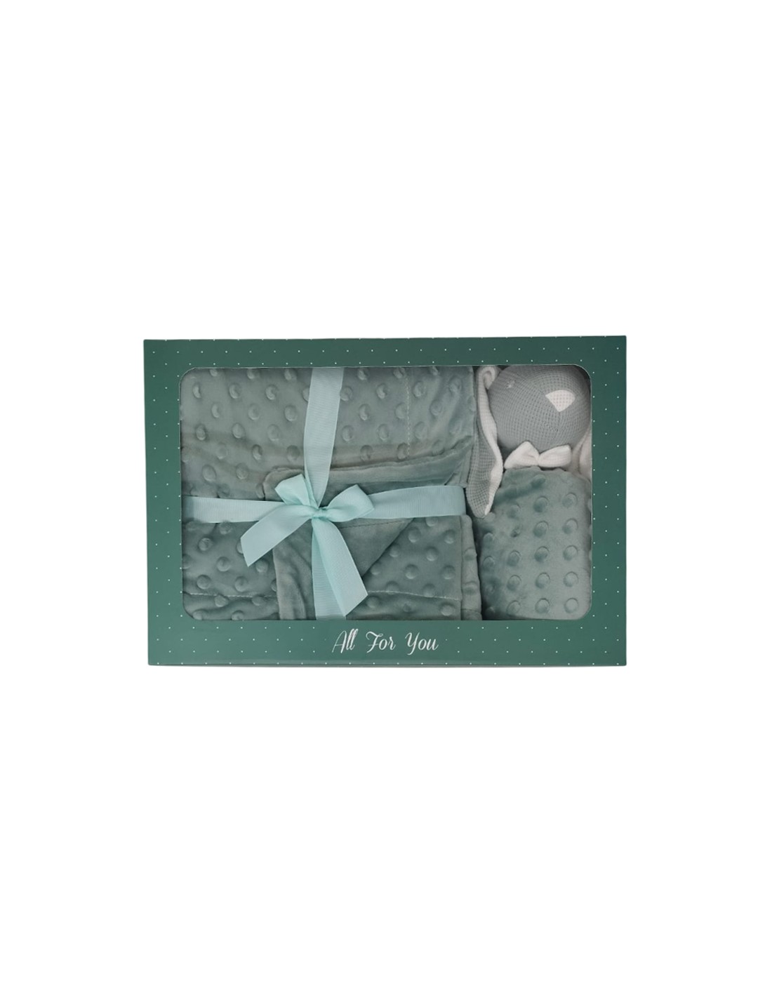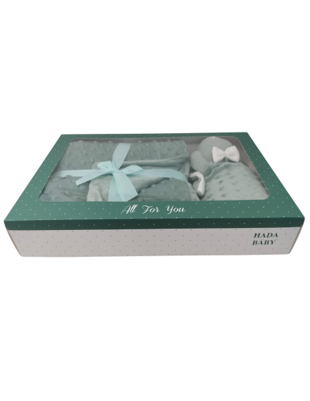 Caja de 12 sets de regalo compuesto por manta de topitos y dou dou de topitos con cabeza de crochet de conejo orejón.